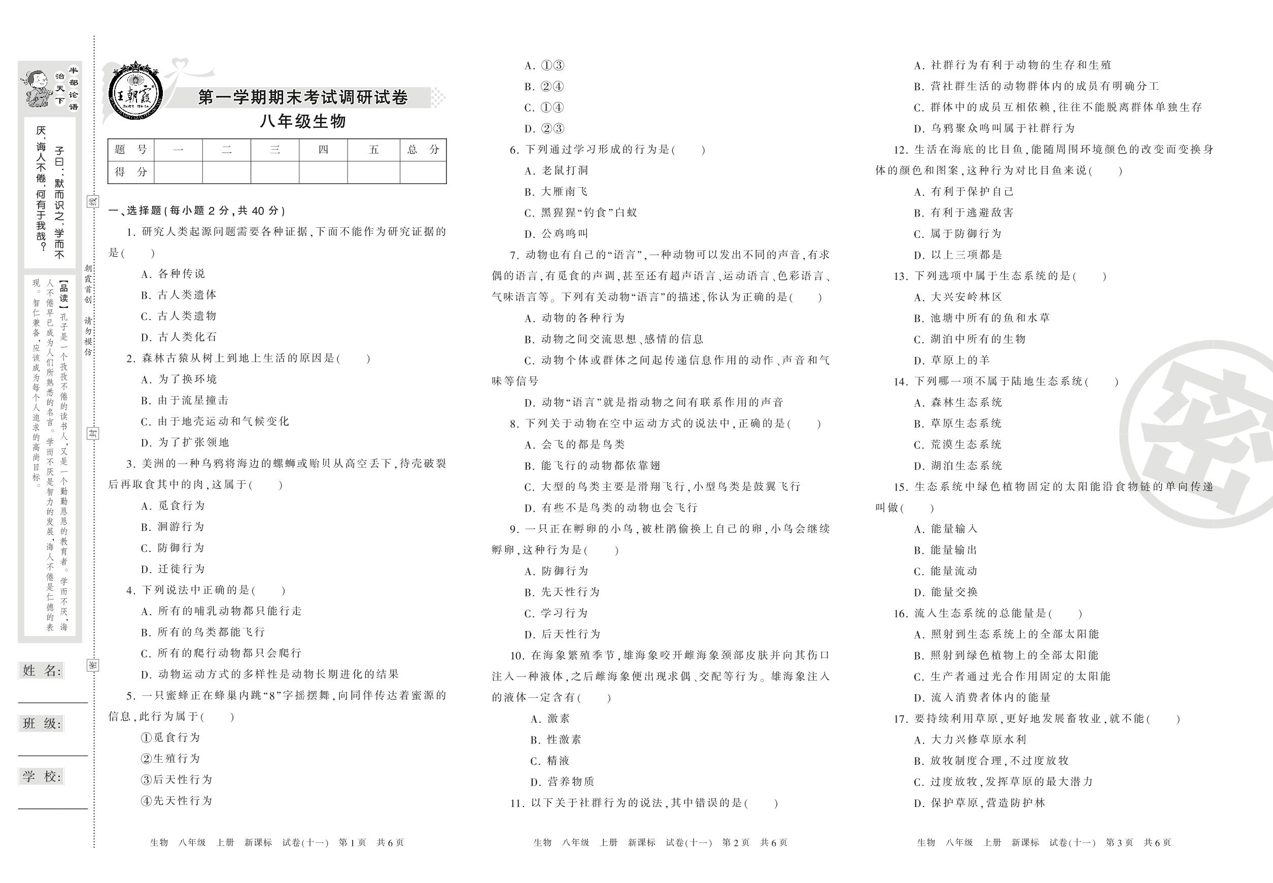 王朝霞期末调研卷八年级上册生物(新课版)【11】