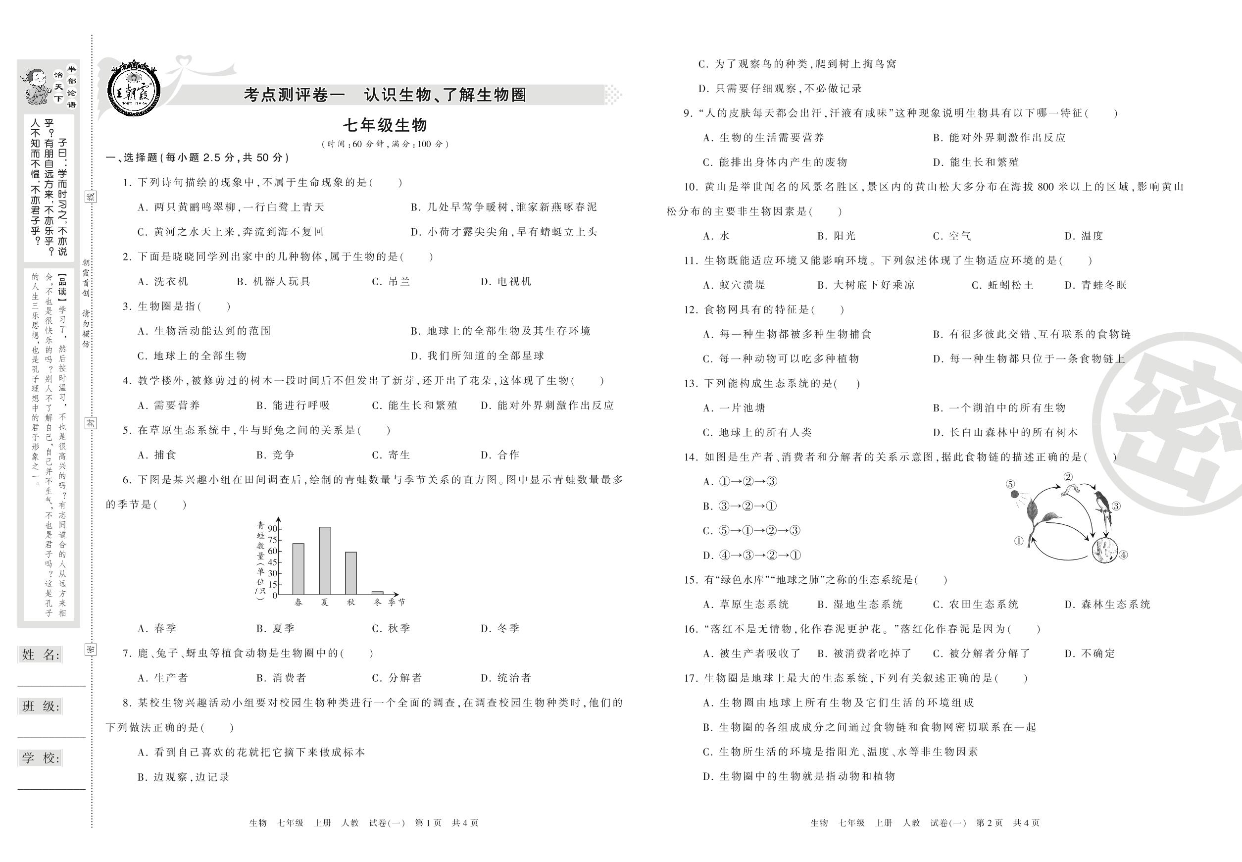 王朝霞期末测评卷七年级上册生物(人教版)【1】
