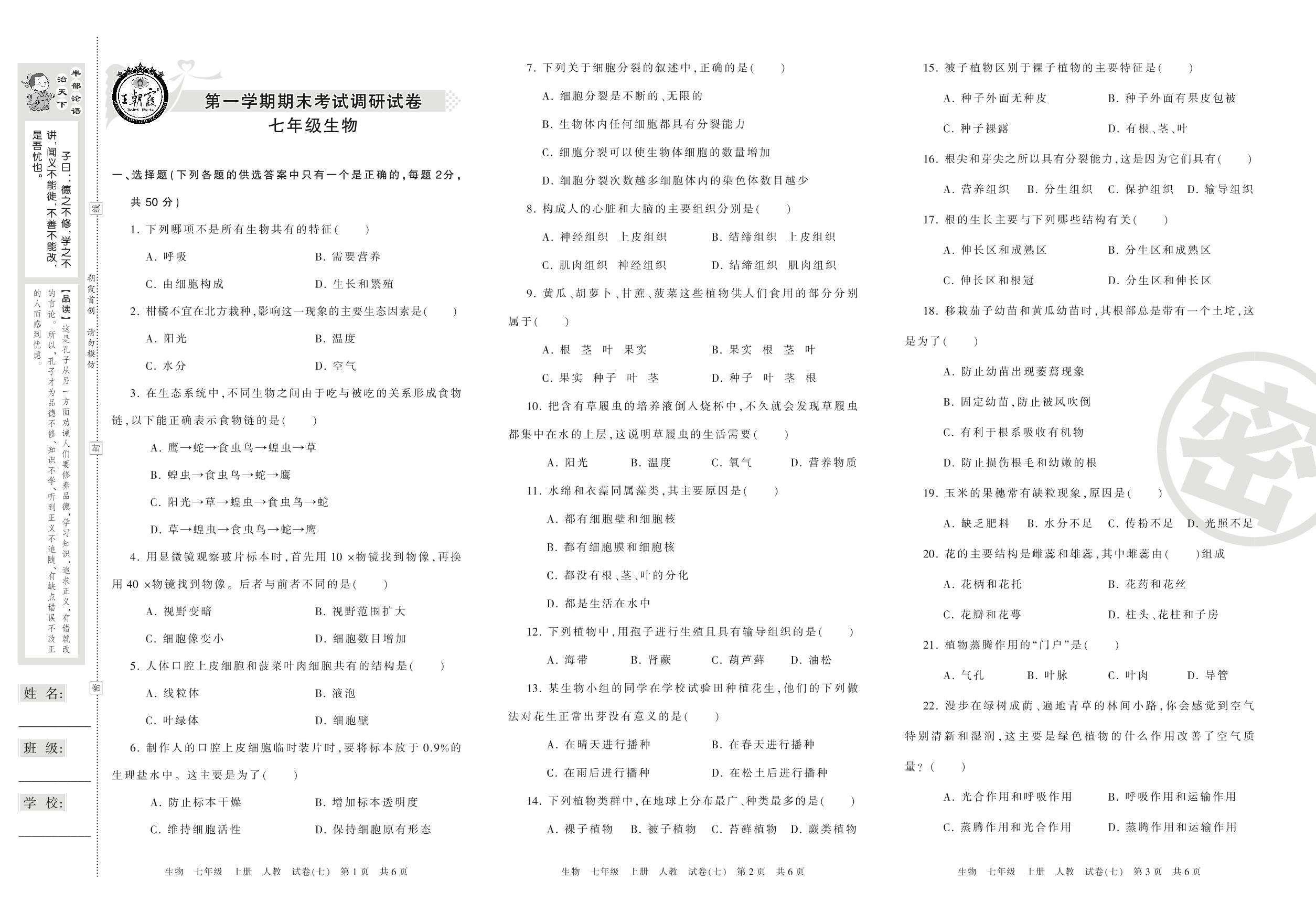 王朝霞期末调研卷七年级上册生物(人教版)【7】
