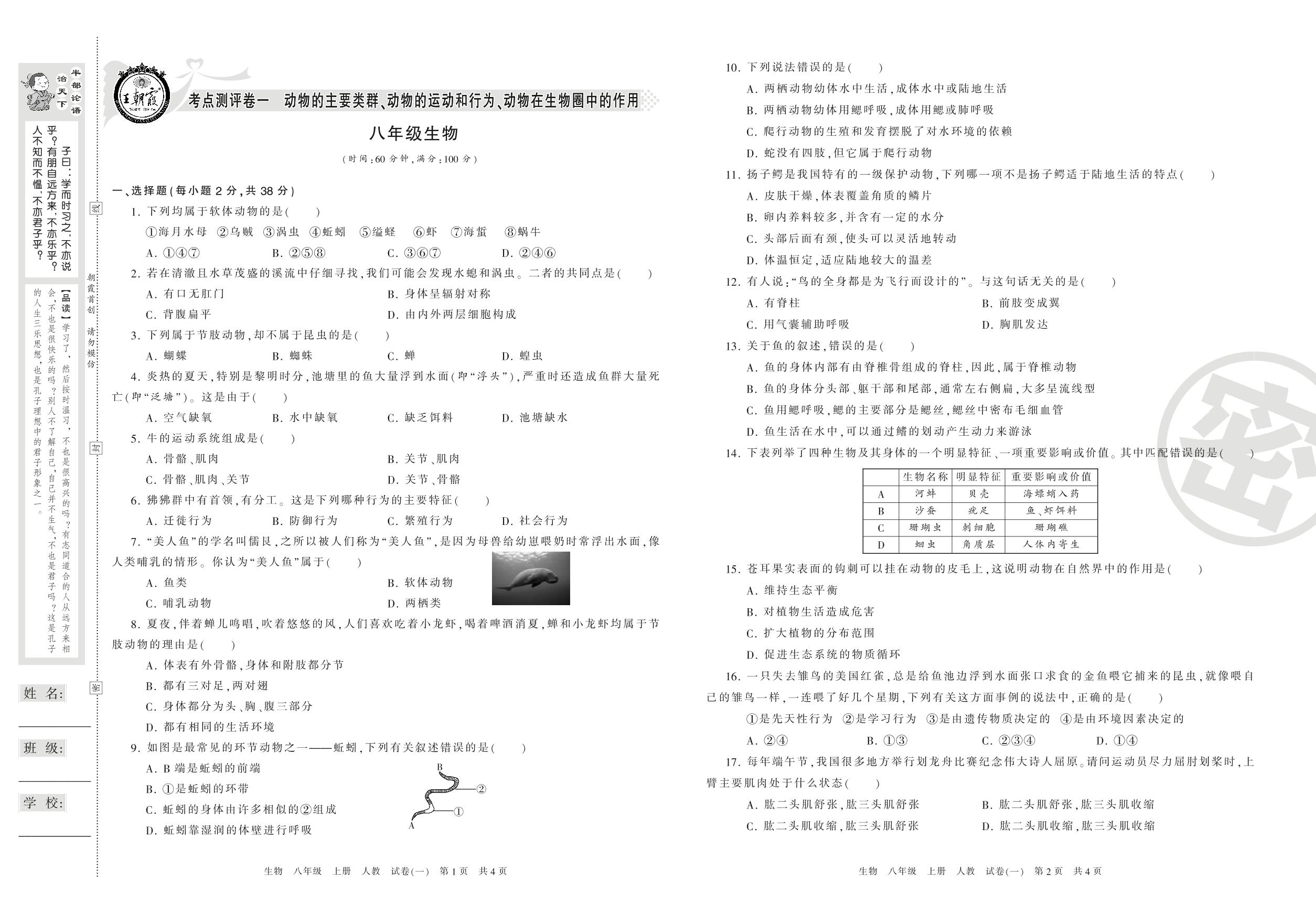 王朝霞期末测评卷八年级上册生物(人教版)【1】