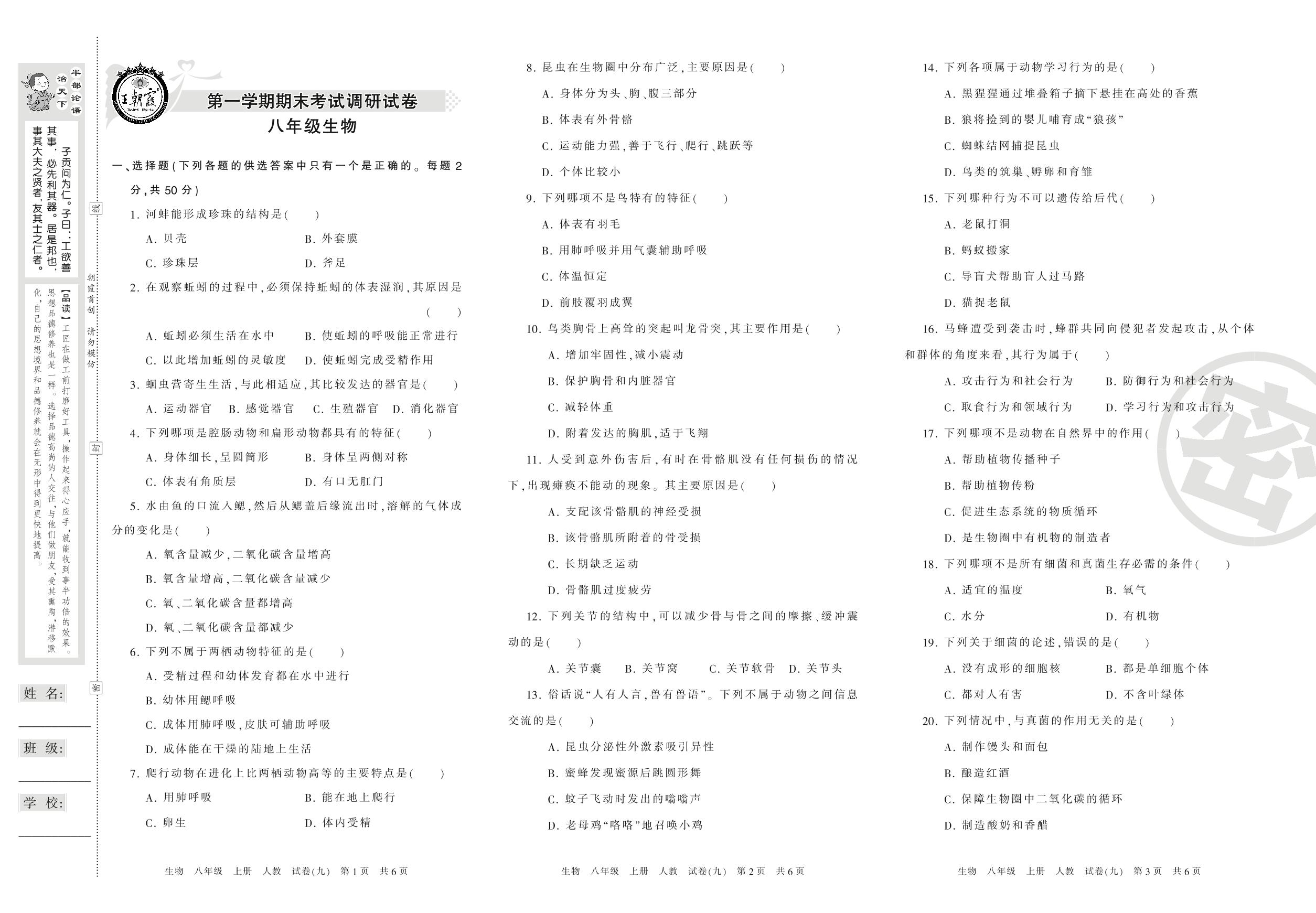 王朝霞期末调研卷八年级上册生物(人教版)【9】