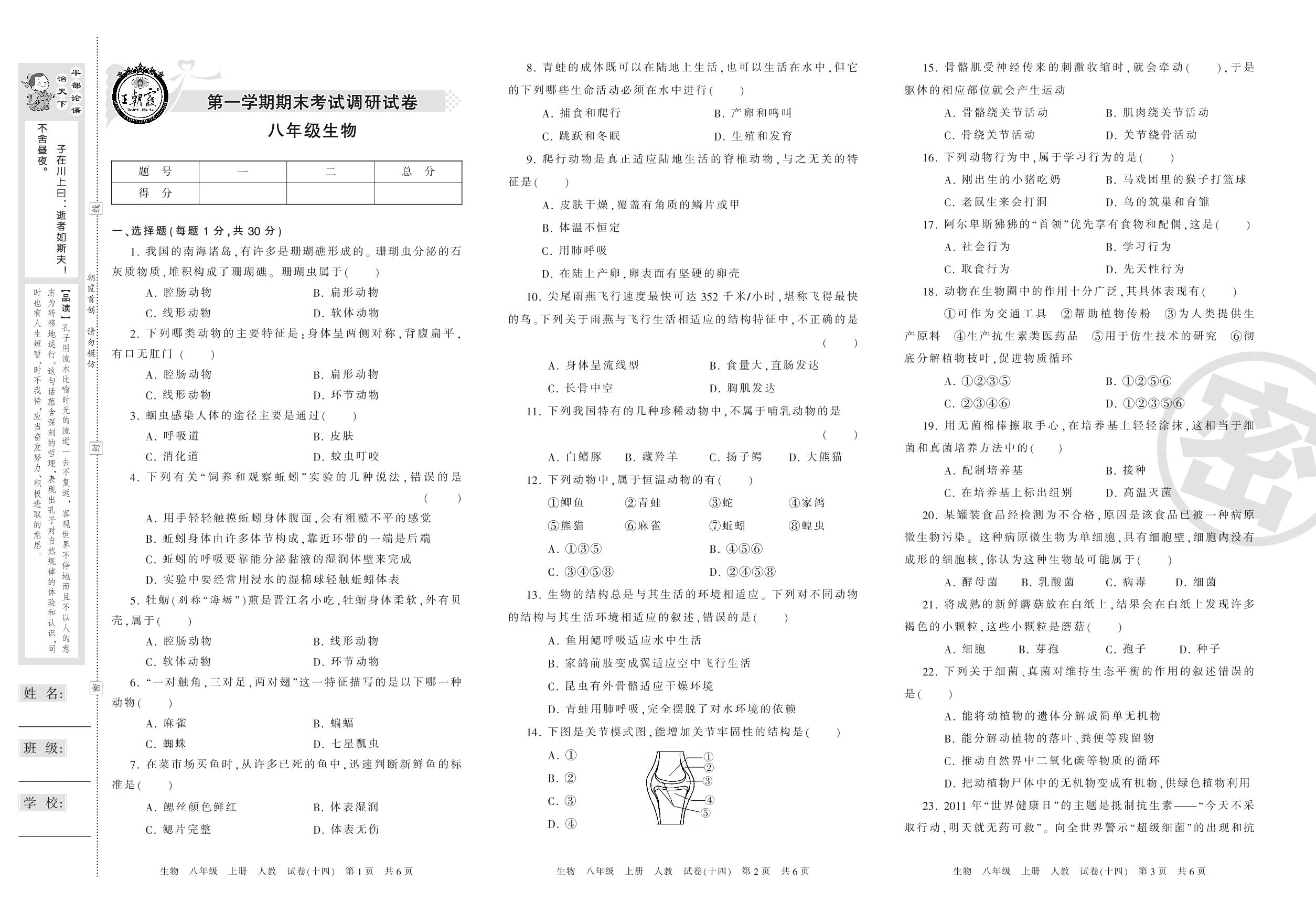 王朝霞期末调研卷八年级上册生物(人教版)【14】
