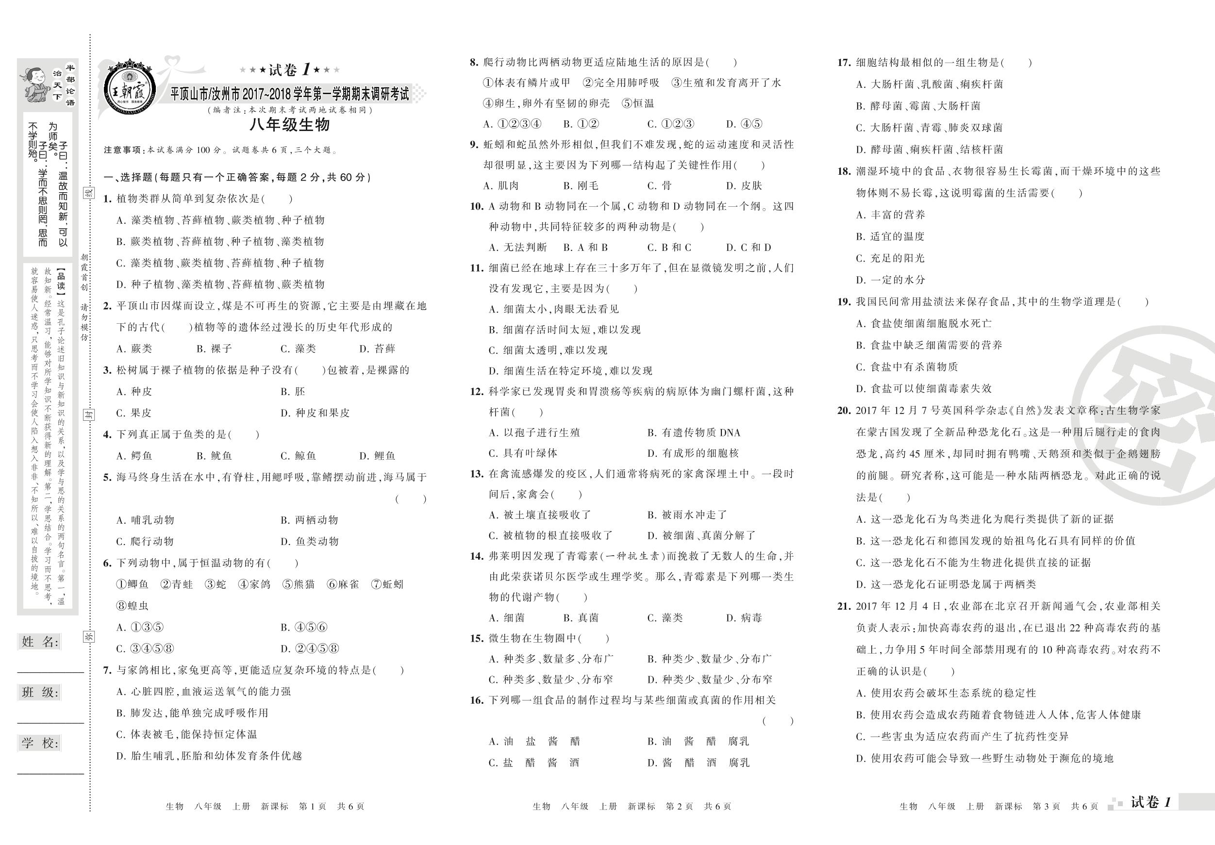 2017-2018学年第一学期平顶山市汝州市八年级生物试卷(新课版)【1】