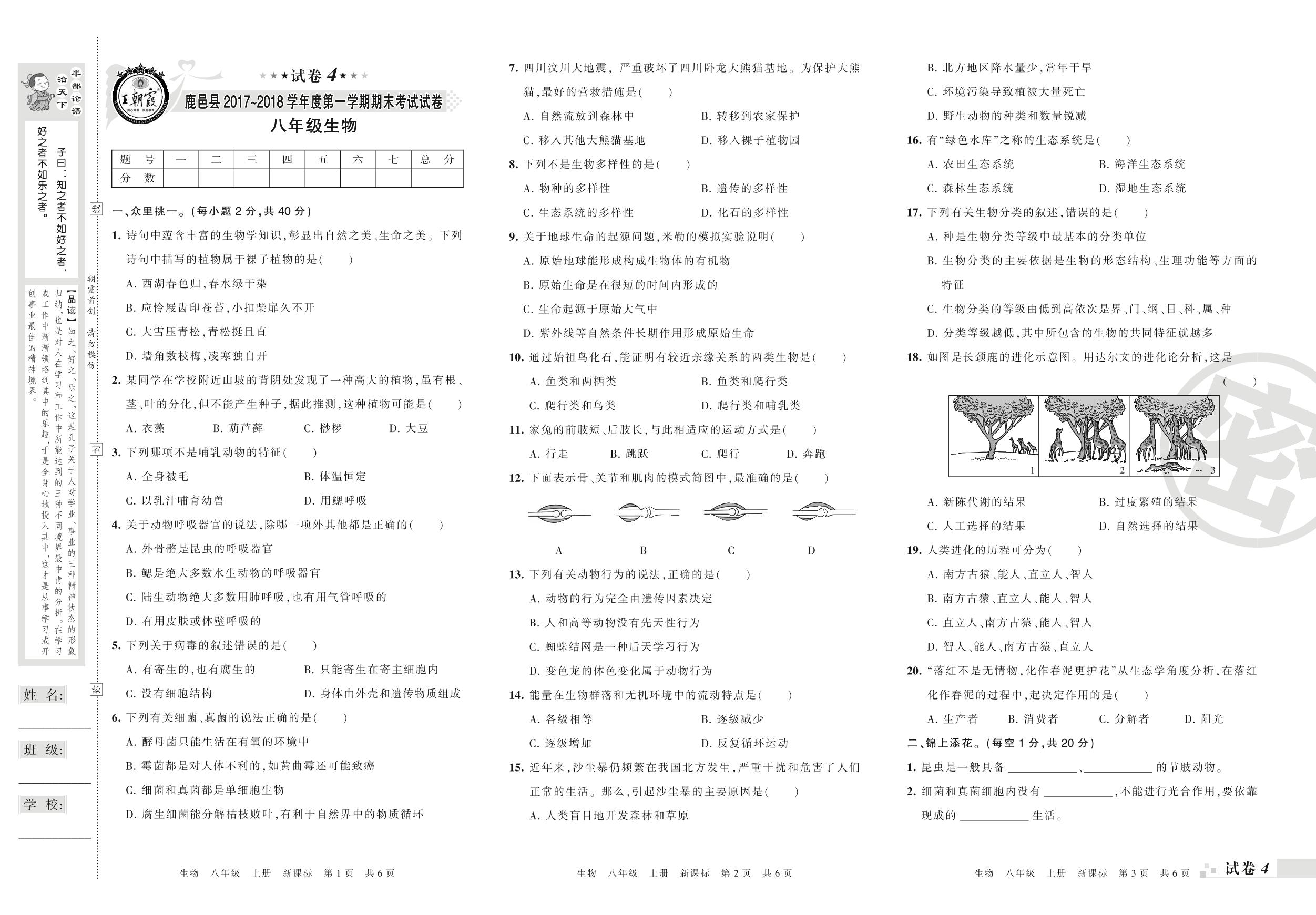 2017-2018学年第一学期周口市鹿邑县八年级生物试卷(新课版)【4】