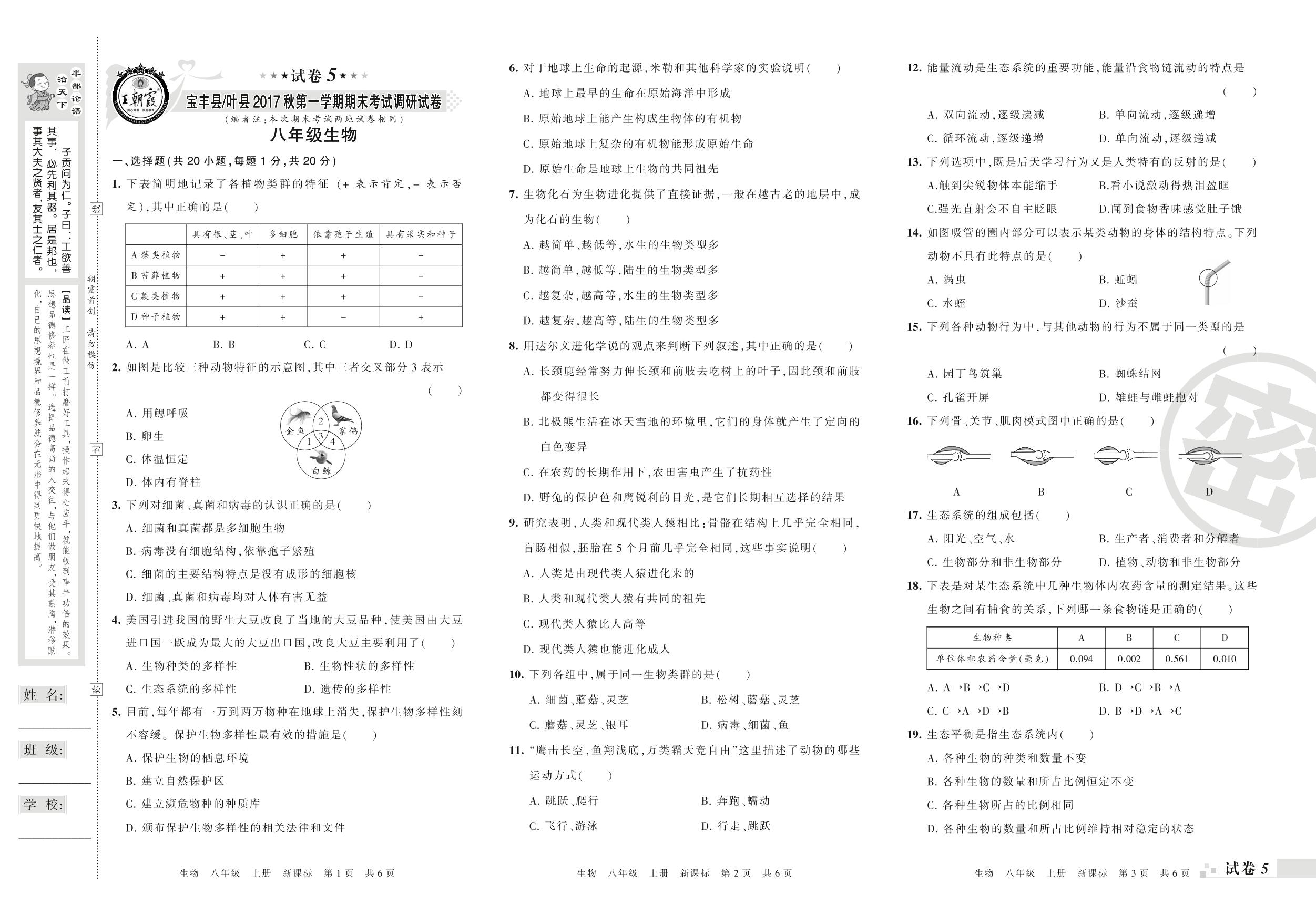 2017-2018学年第一学期平顶山市宝丰县叶县八年级生物试卷(新课版)【5】