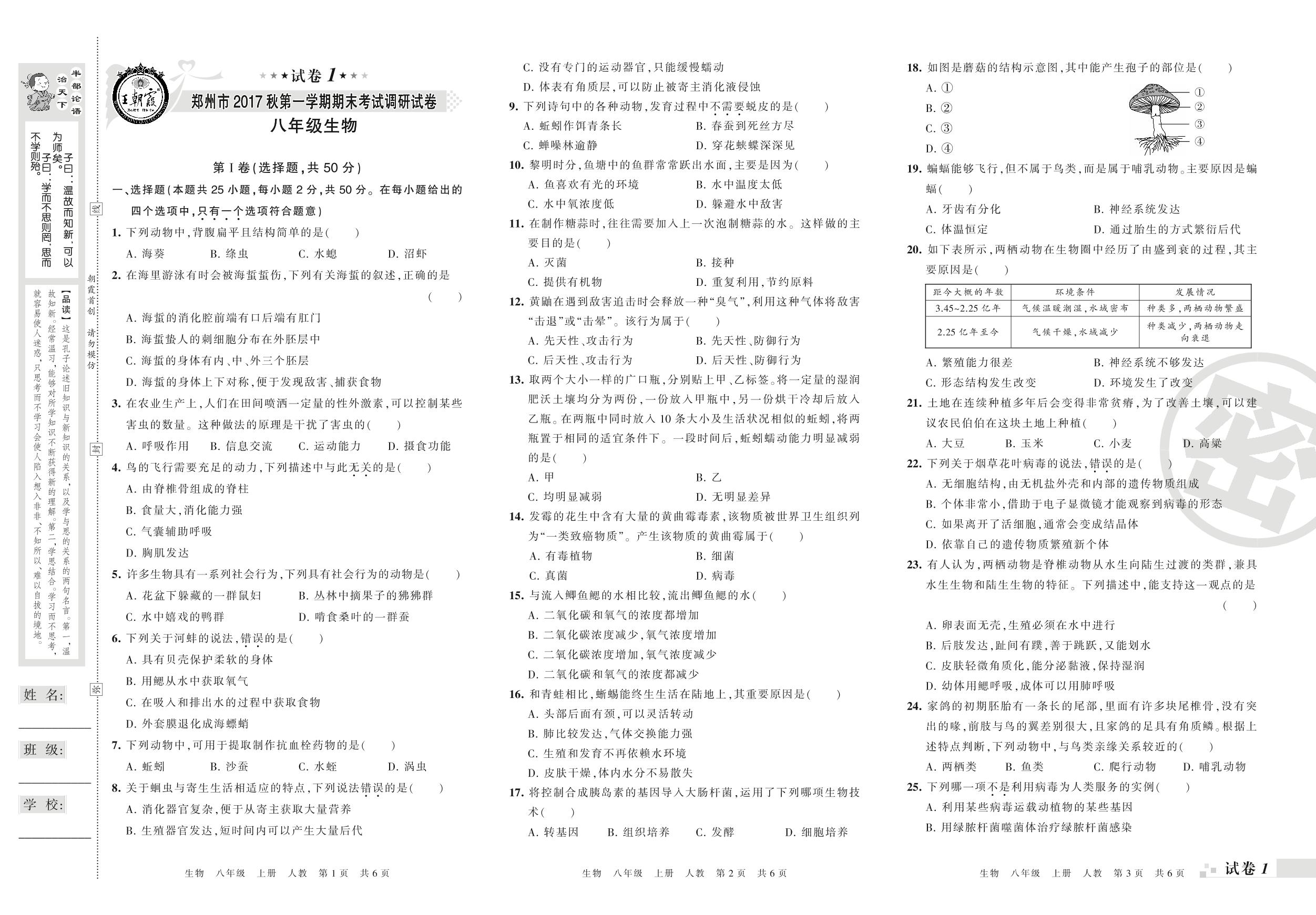 2017-2018学年第一学期郑州市八年级生物试卷(人教版)【1】