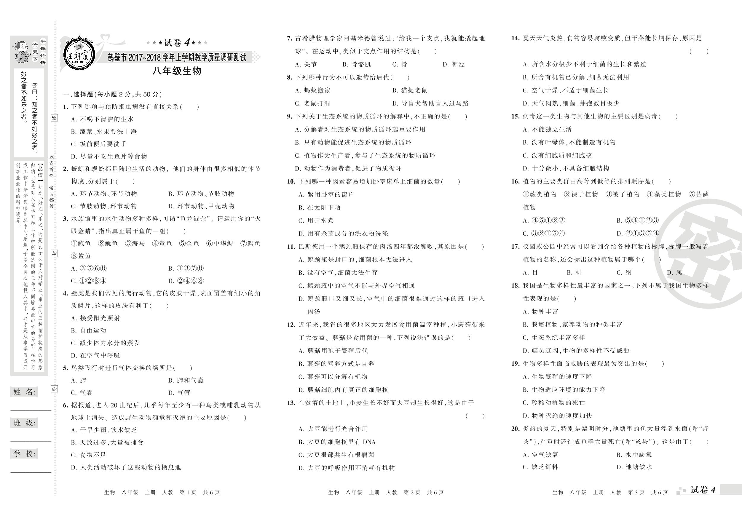 2017-2018学年第一学期鹤壁市八年级生物试卷(人教版)【4】