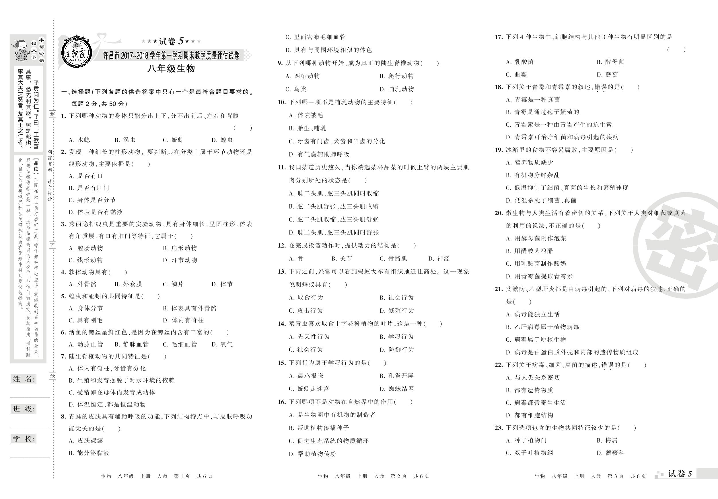 2017-2018学年第一学期许昌市八年级生物试卷(人教版)【5】