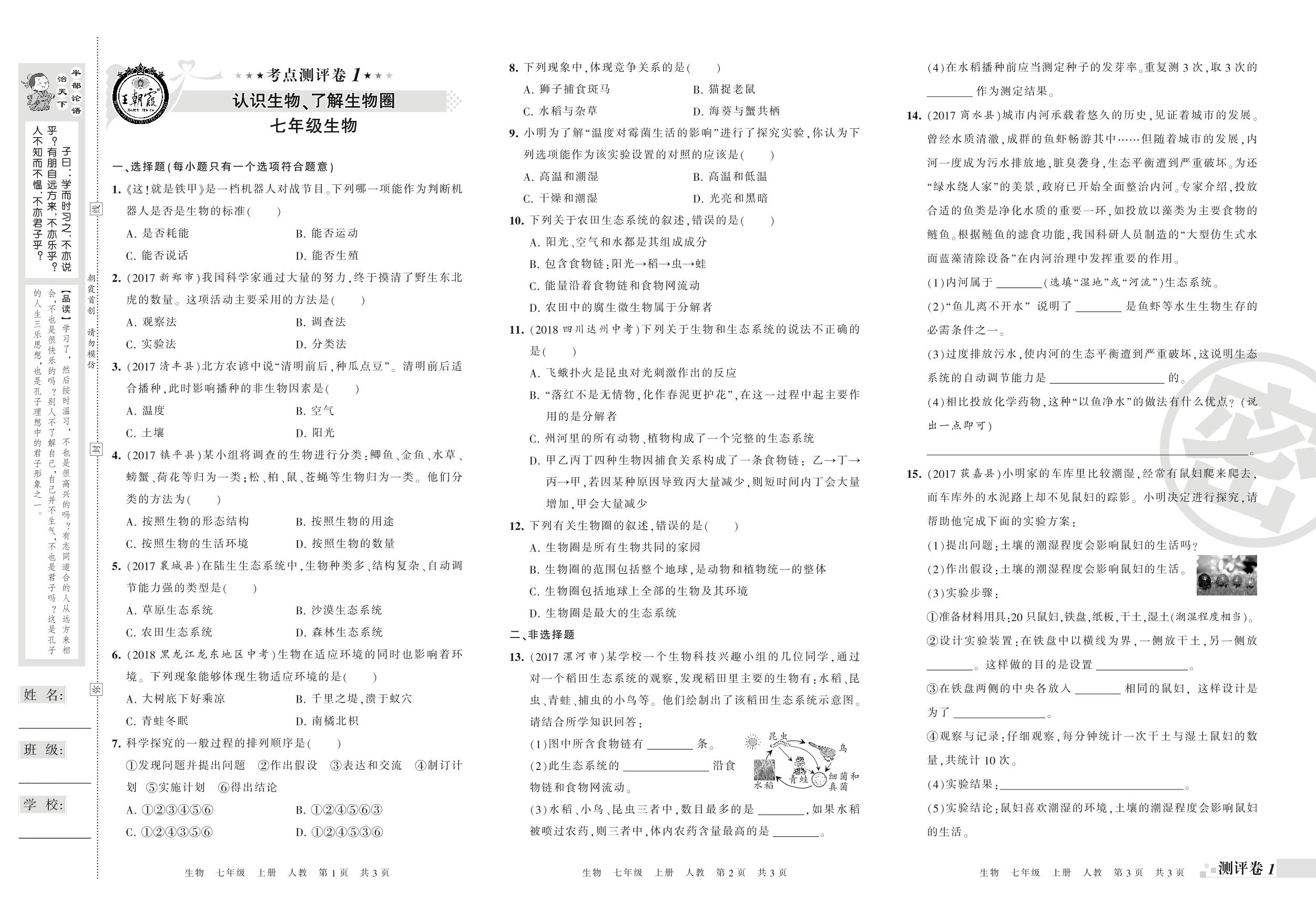王朝霞期末测评卷——认识生物、了解生物圈、细胞是生命活动的基本单位七年级上册生物(人教版)_R210812105106【0】