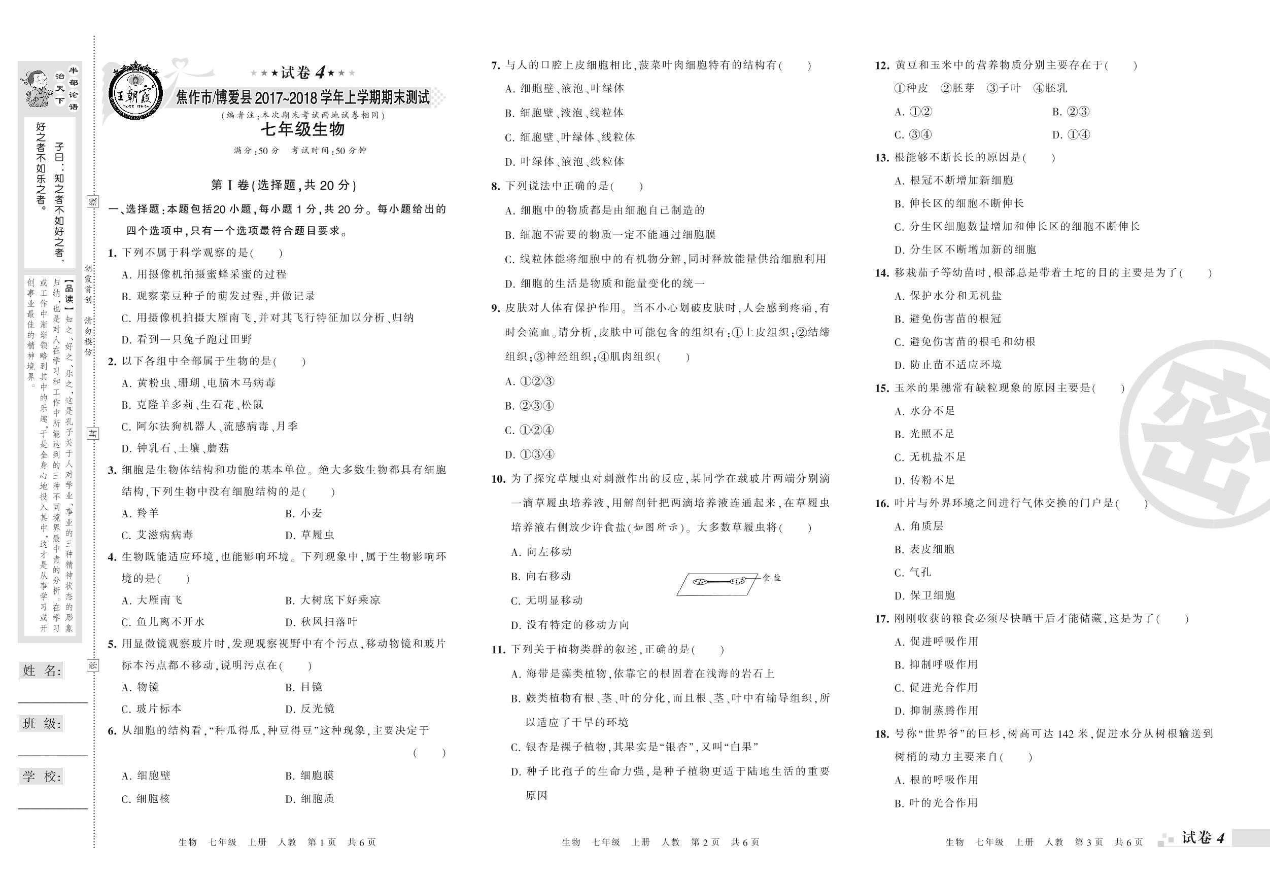 2017-2018学年第一学期焦作市 博爱县七年级生物试卷(人教版)【4】