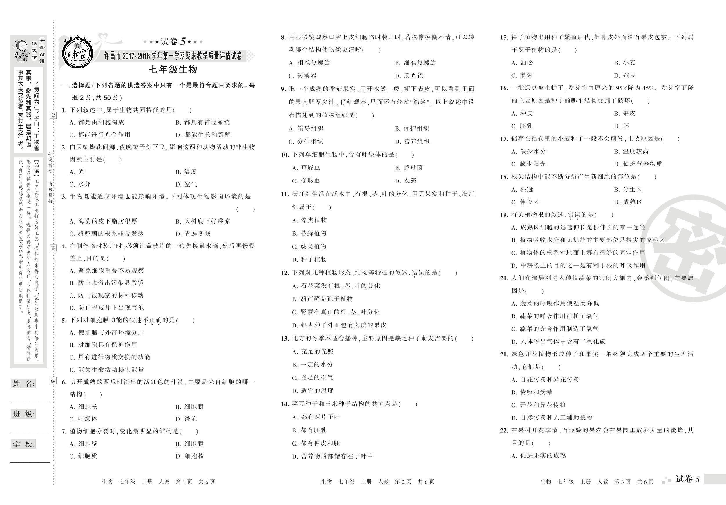 2017-2018学年第一学期许昌市七年级生物试卷(人教版)【5】