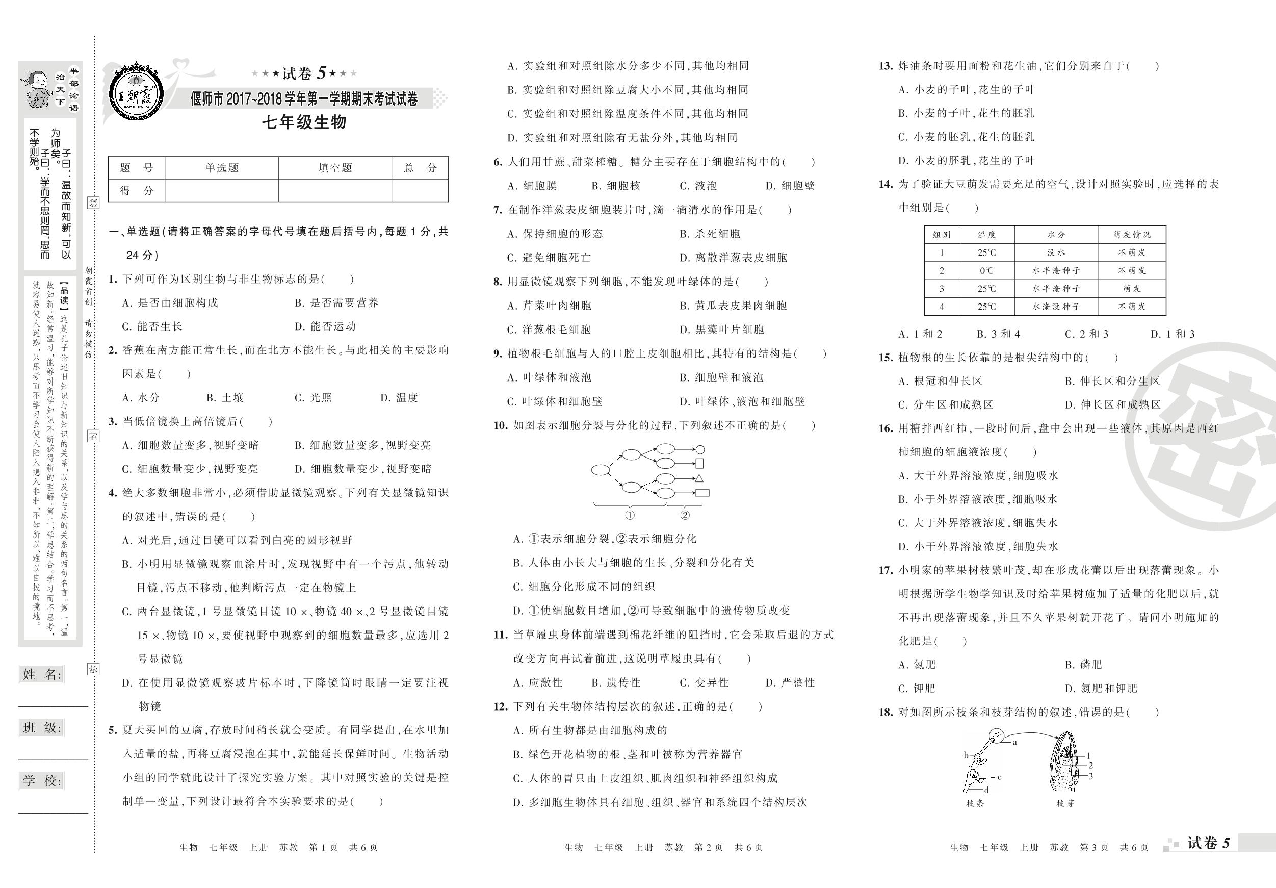 2017-2018学年第一学期偃师市七年级生物试卷(苏教版)【5】