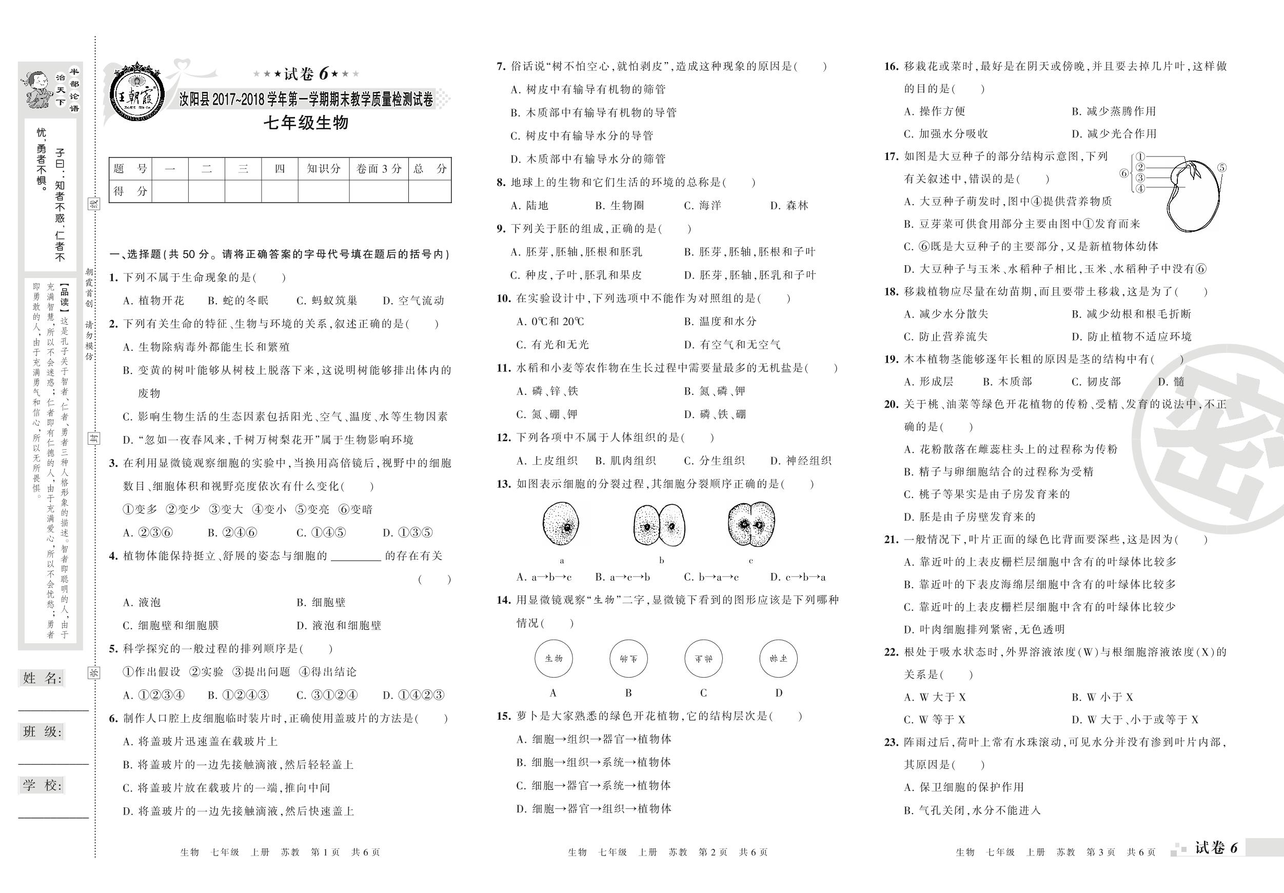 2017-2018学年第一学期洛阳市汝阳县七年级生物试卷(苏教版)【6】