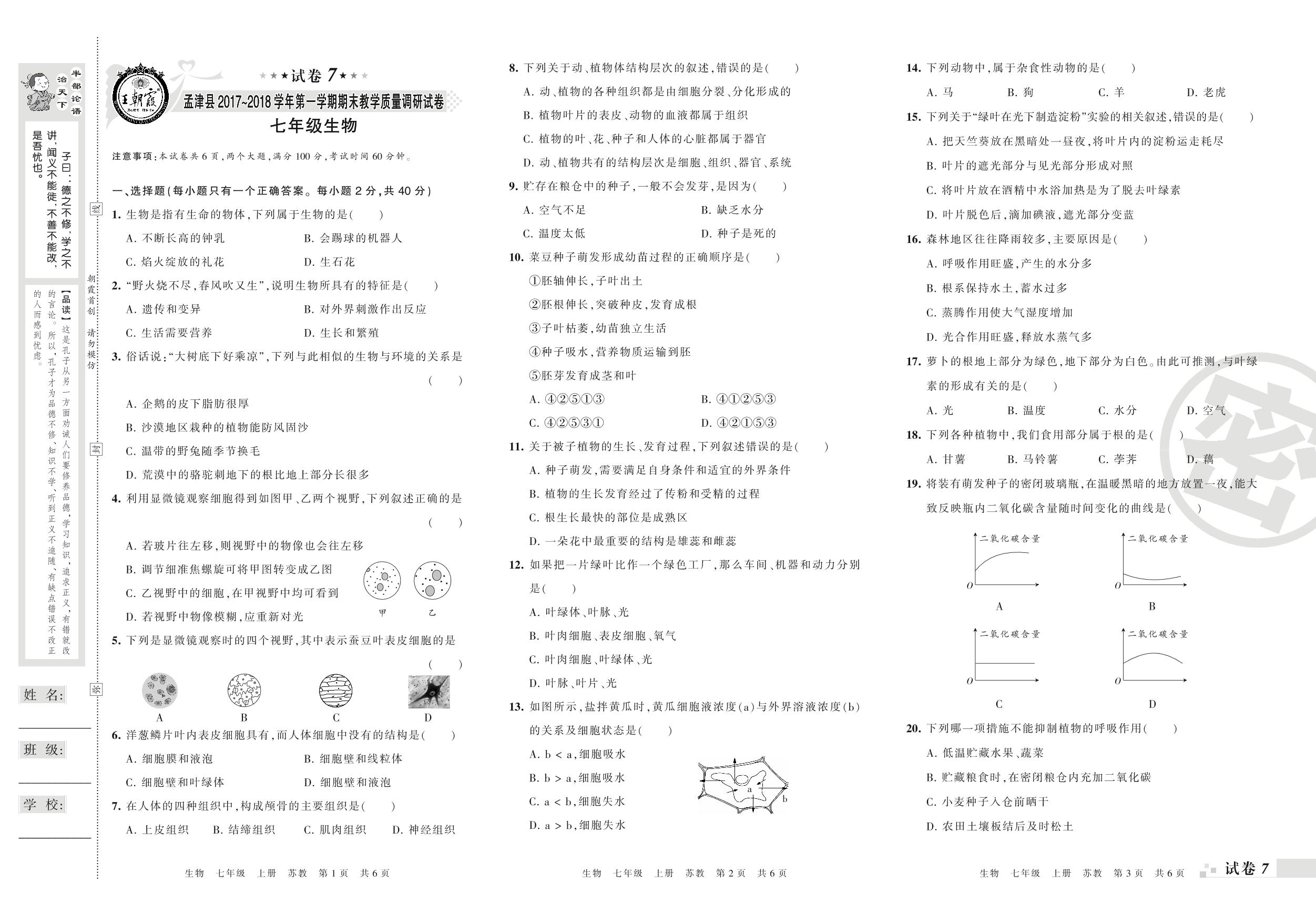 2017-2018学年第一学期洛阳市孟津县七年级生物试卷(苏教版)【7】