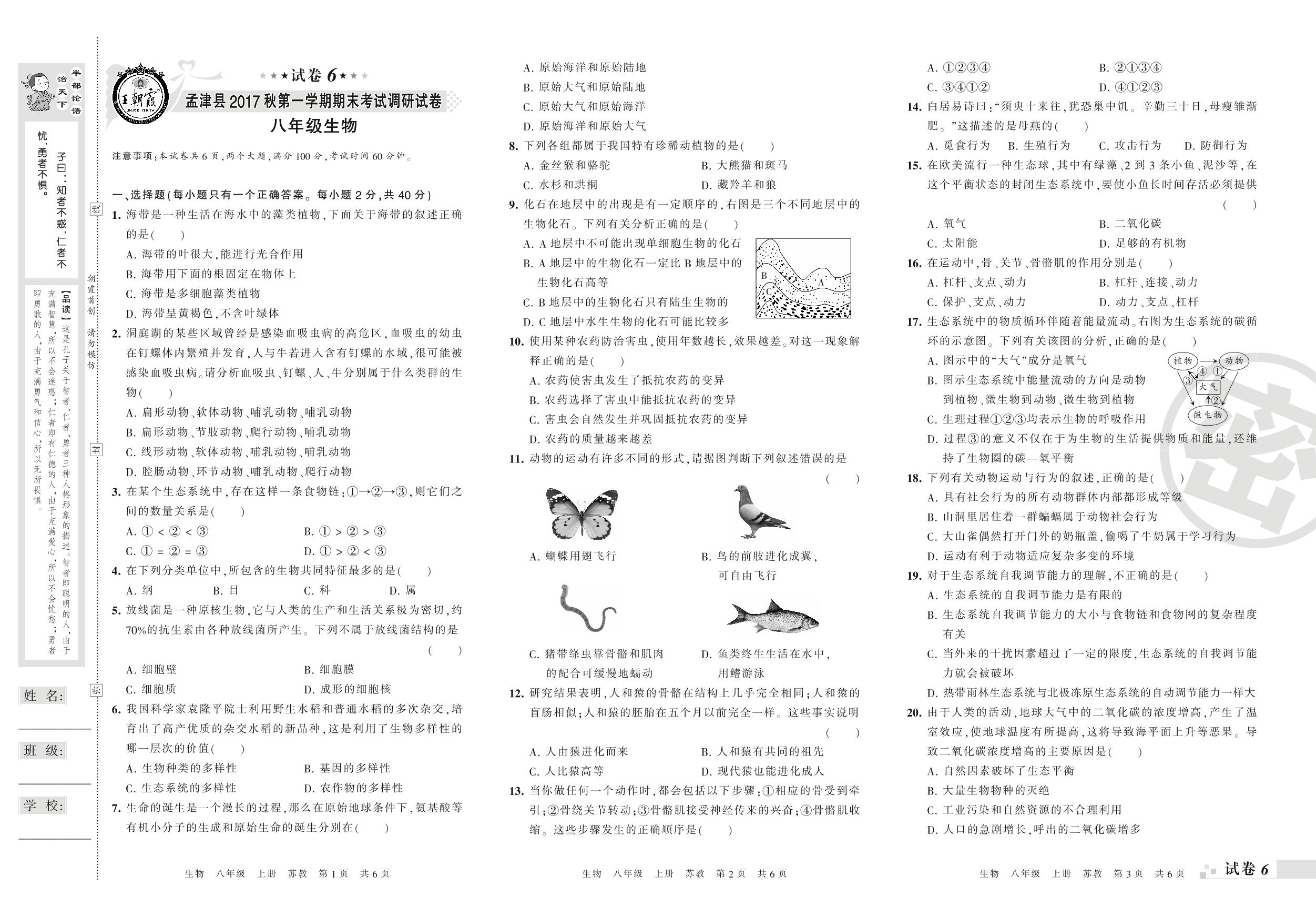 2017-2018学年第一学期洛阳市孟津县八年级生物试卷(苏教版)【6】