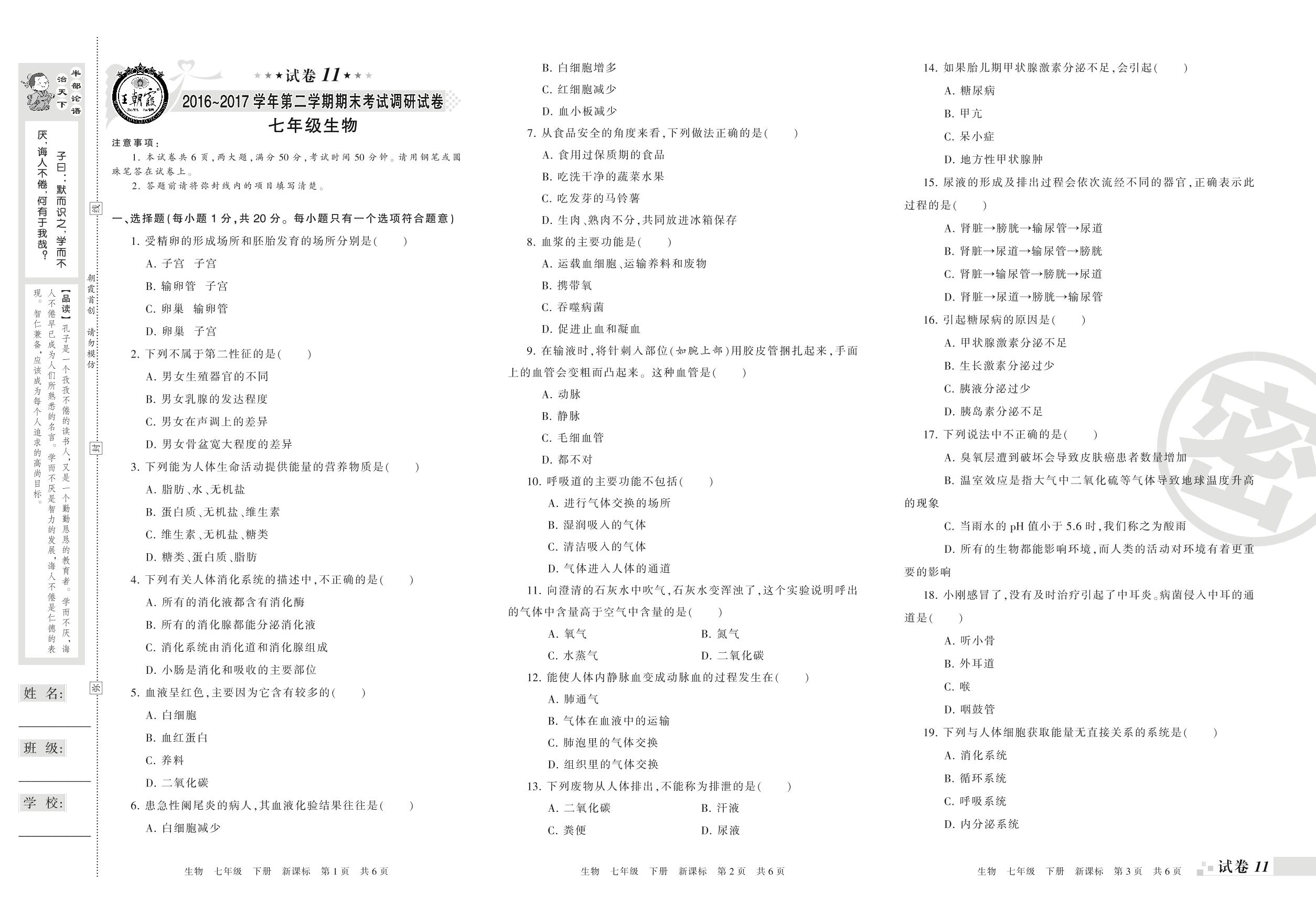 2016-2017学年第二学期期末考试调研试卷七年级生物(新课版)【11】