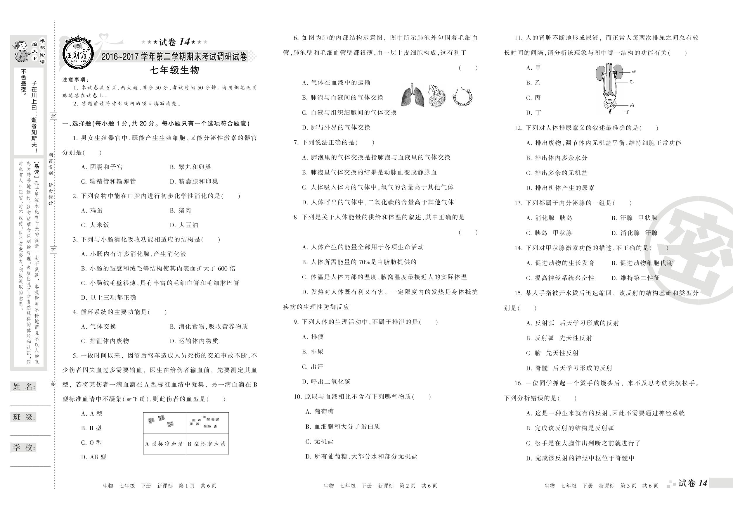 2016-2017学年第二学期期末考试调研试卷七年级生物(新课版)【14】