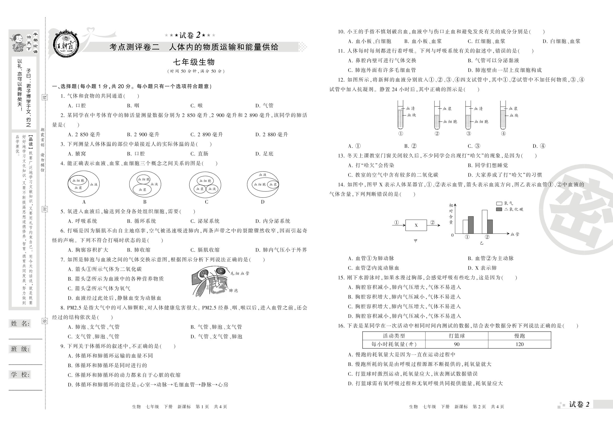 王朝霞期末测评卷——考点测评卷二 人体内的物质运输和能量供给七年级下册生物(新课版)【2】