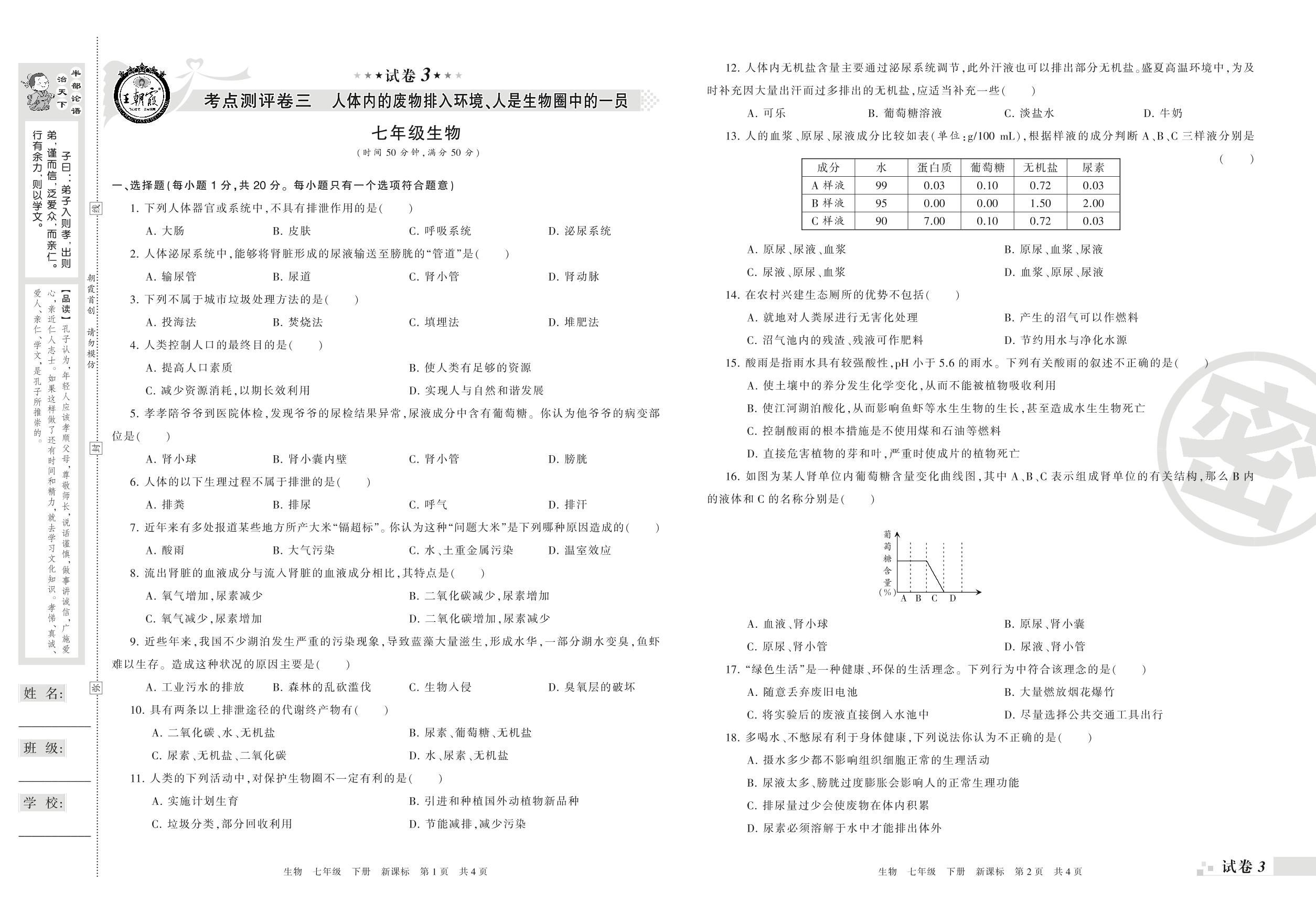 王朝霞期末测评卷——考点测评卷三 人体内的废物排入环境、人是生物圈中的一员七年级下册生物(新课版)【3】