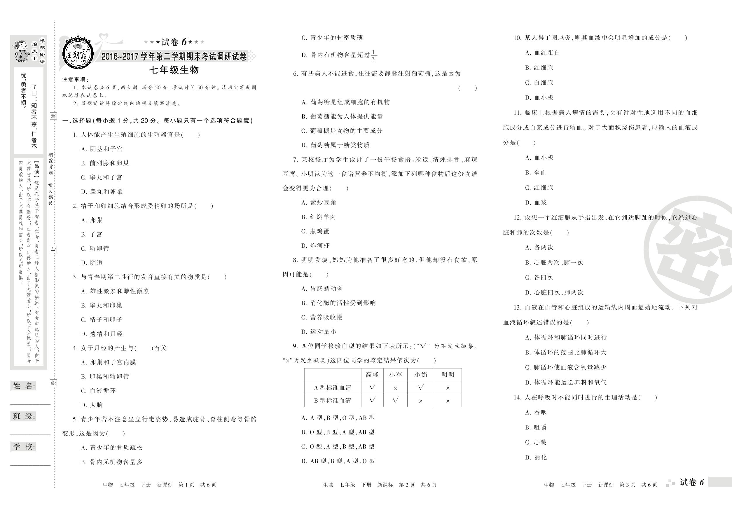 七年级生物新课标版下册期末卷