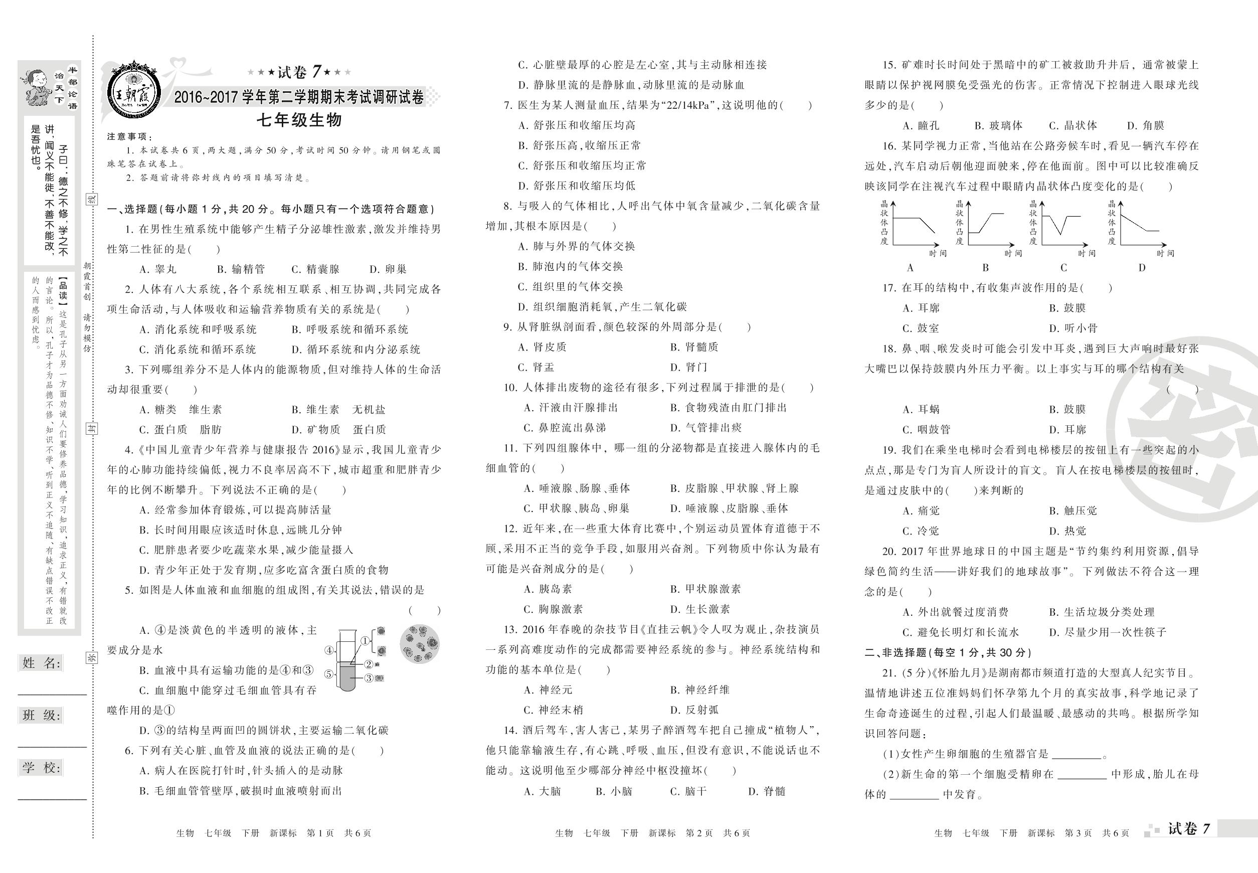 2016-2017学年第二学期期末考试调研试卷七年级生物(新课版)【7】