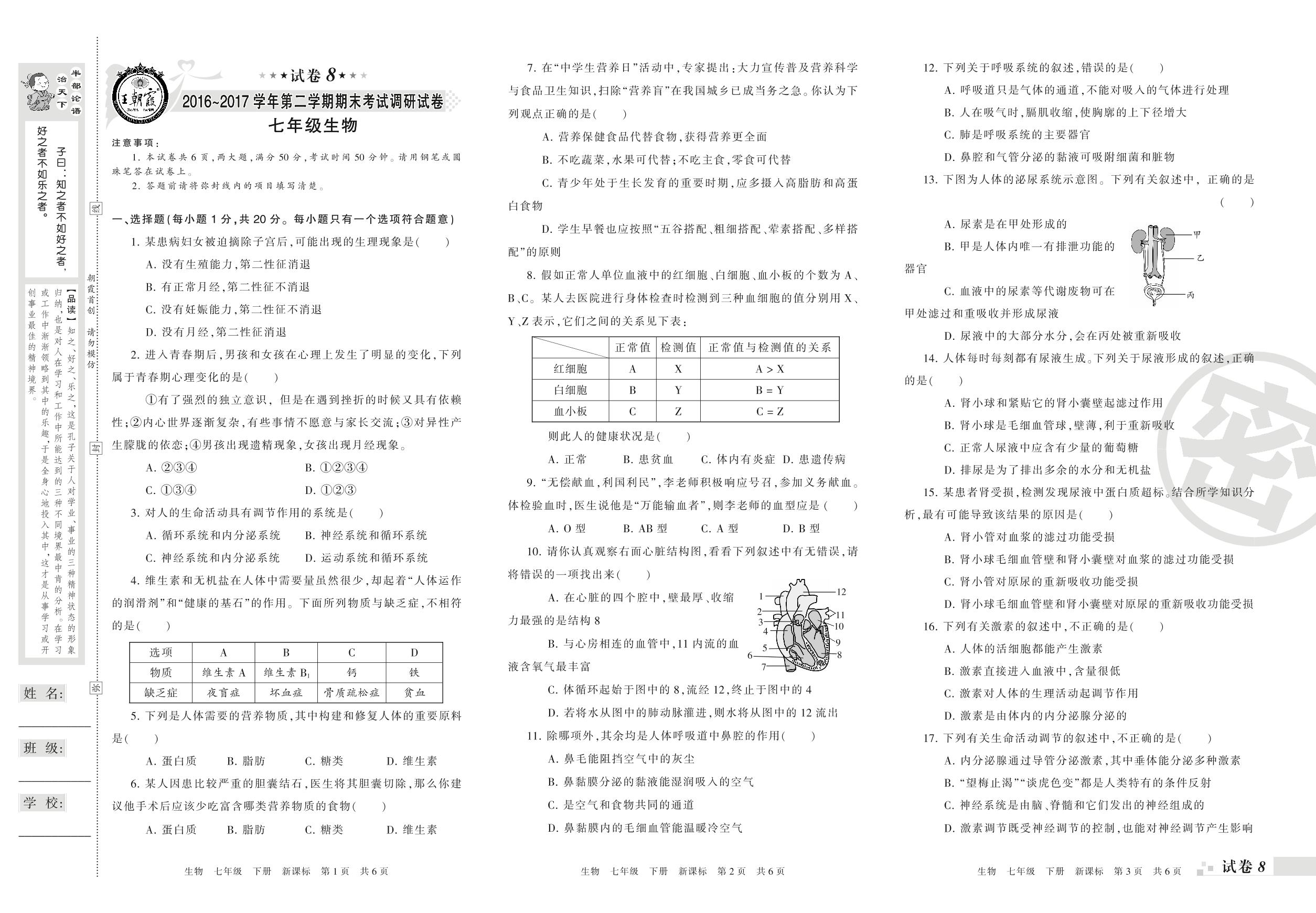 2016-2017学年第二学期期末考试调研试卷七年级生物(新课版)【8】