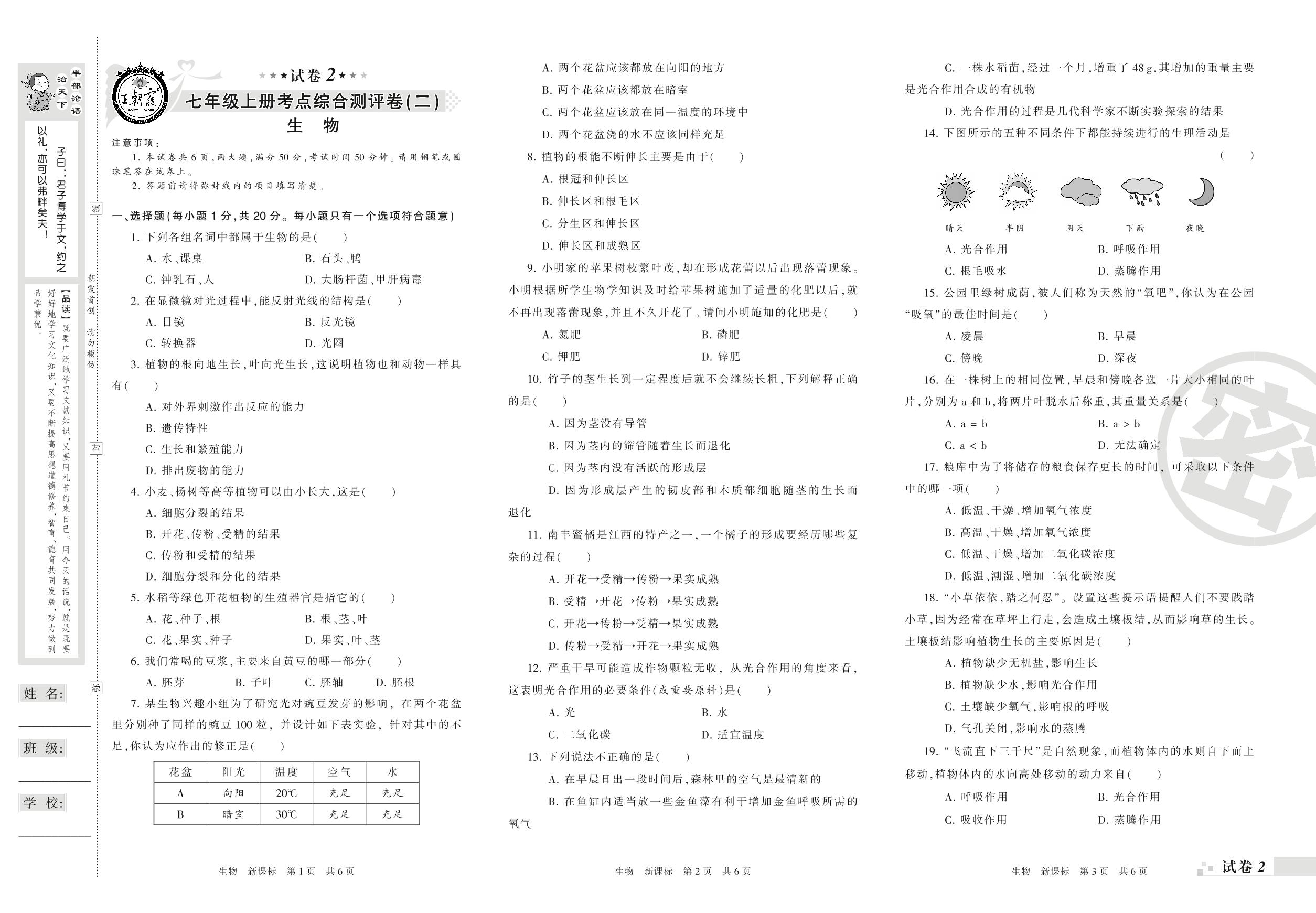 王朝霞期末测评卷——考点综合测评卷(二)七年级上册生物(新课版)【2】