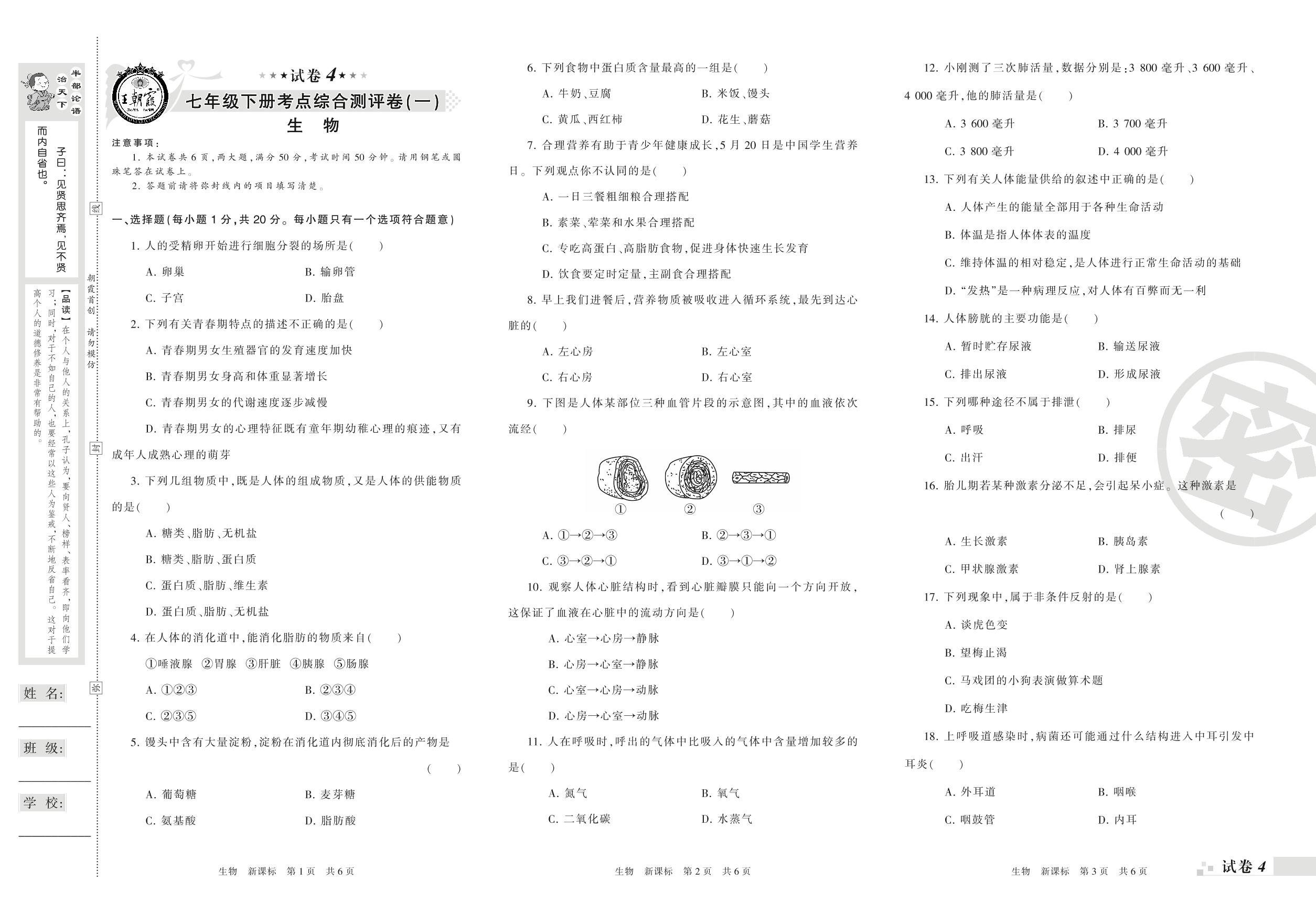 王朝霞期末测评卷——考点综合测评卷(一)七年级下册生物(新课版)【4】