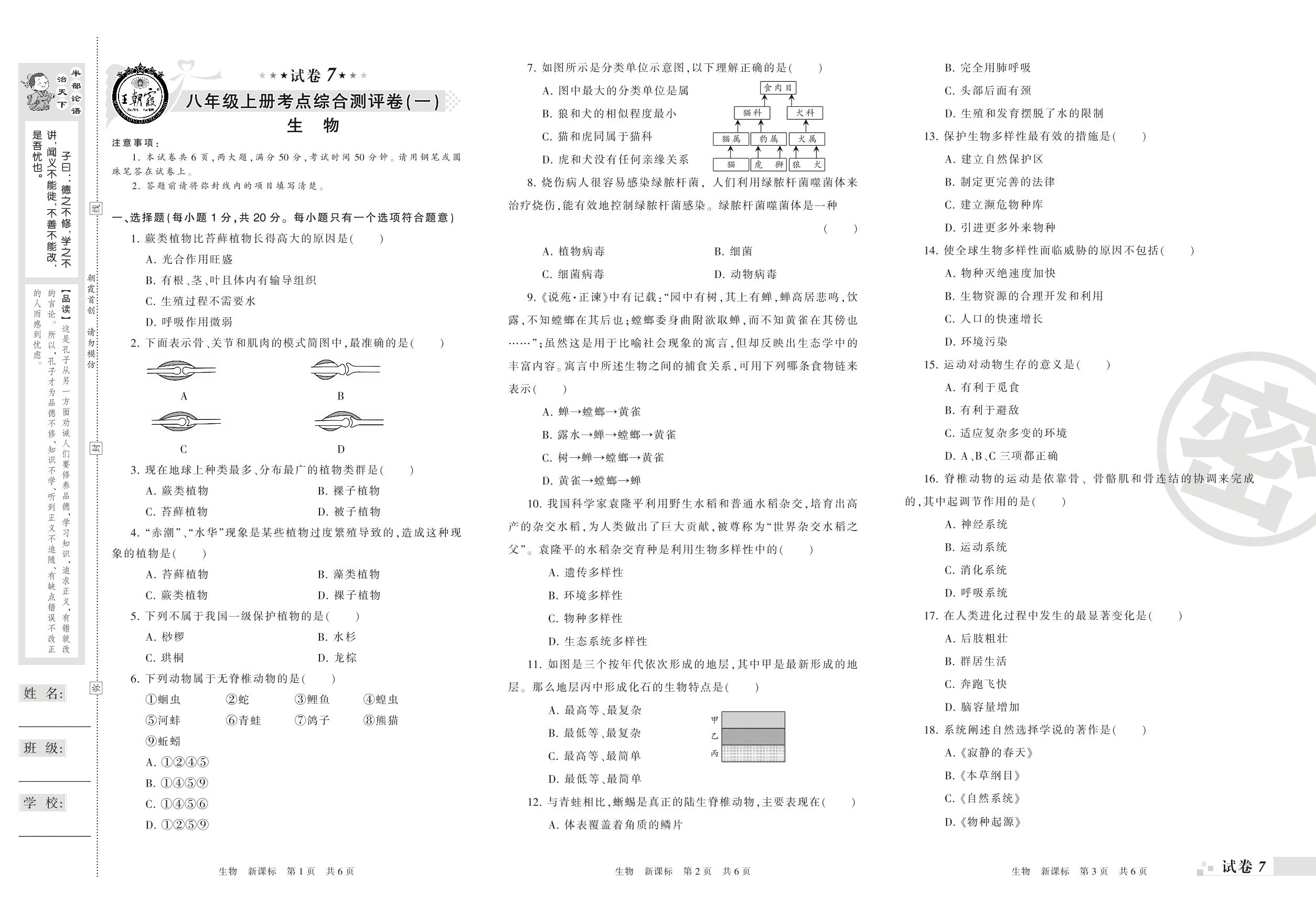 王朝霞期末测评卷——考点综合测评卷(一)八年级上册生物(新课版)【7】