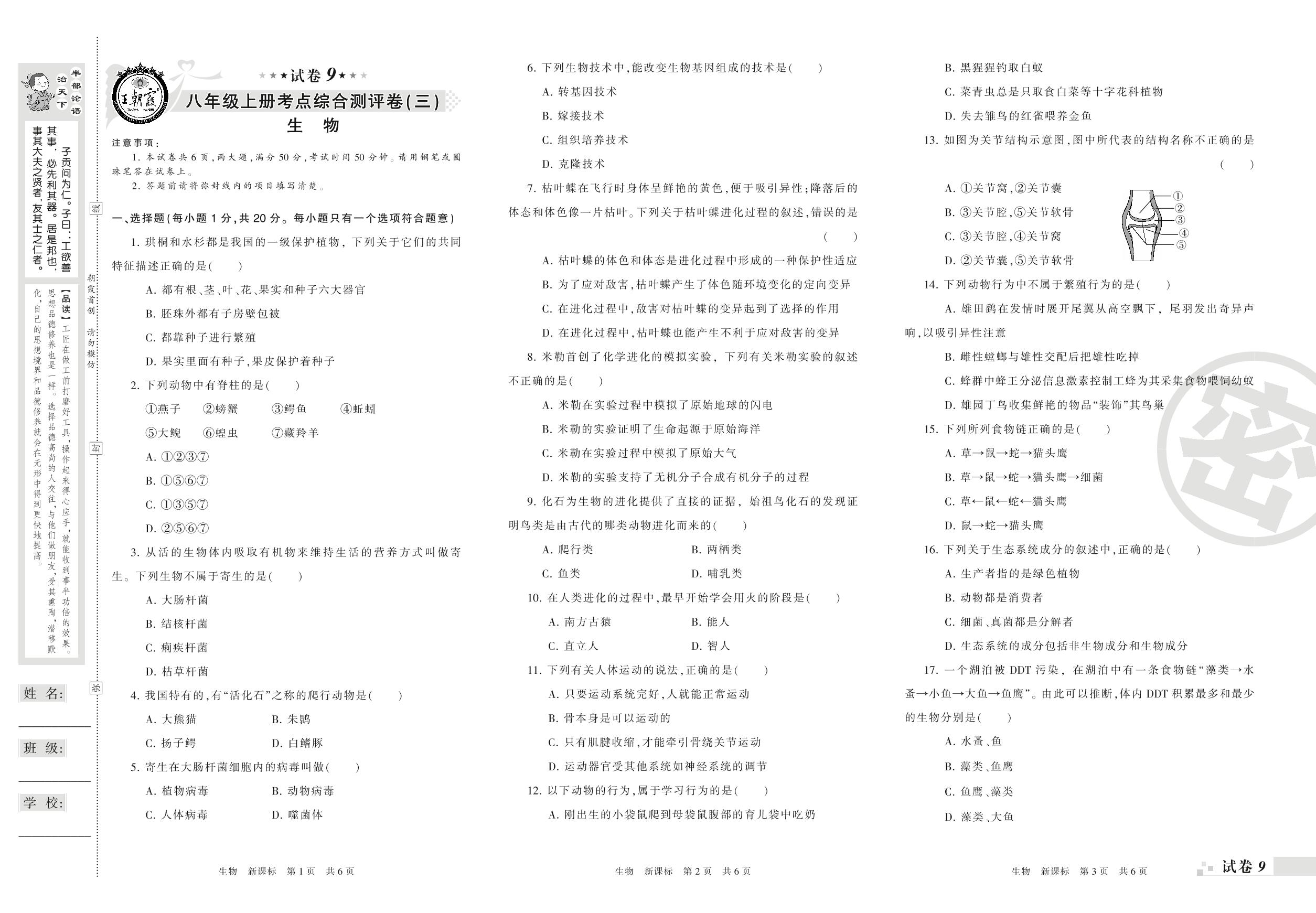 王朝霞期末测评卷——考点综合测评卷(三)八年级上册生物(新课版【9】