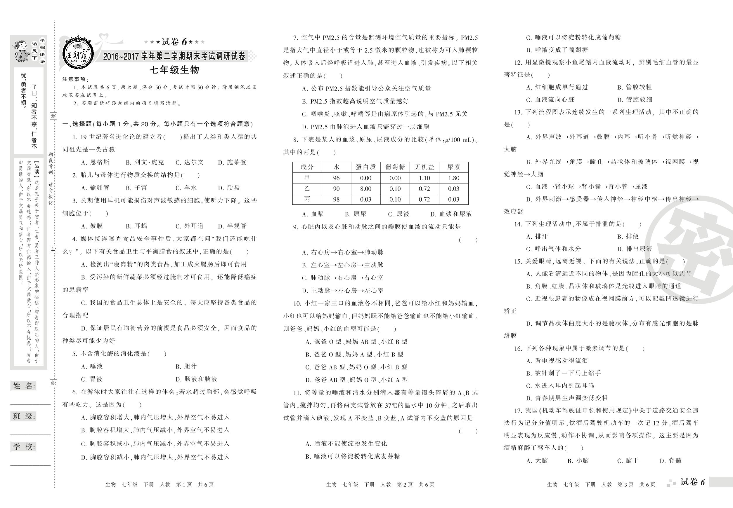 2016-2017学年第二学期期末考试调研试卷七年级下册生物(人教版)【6】