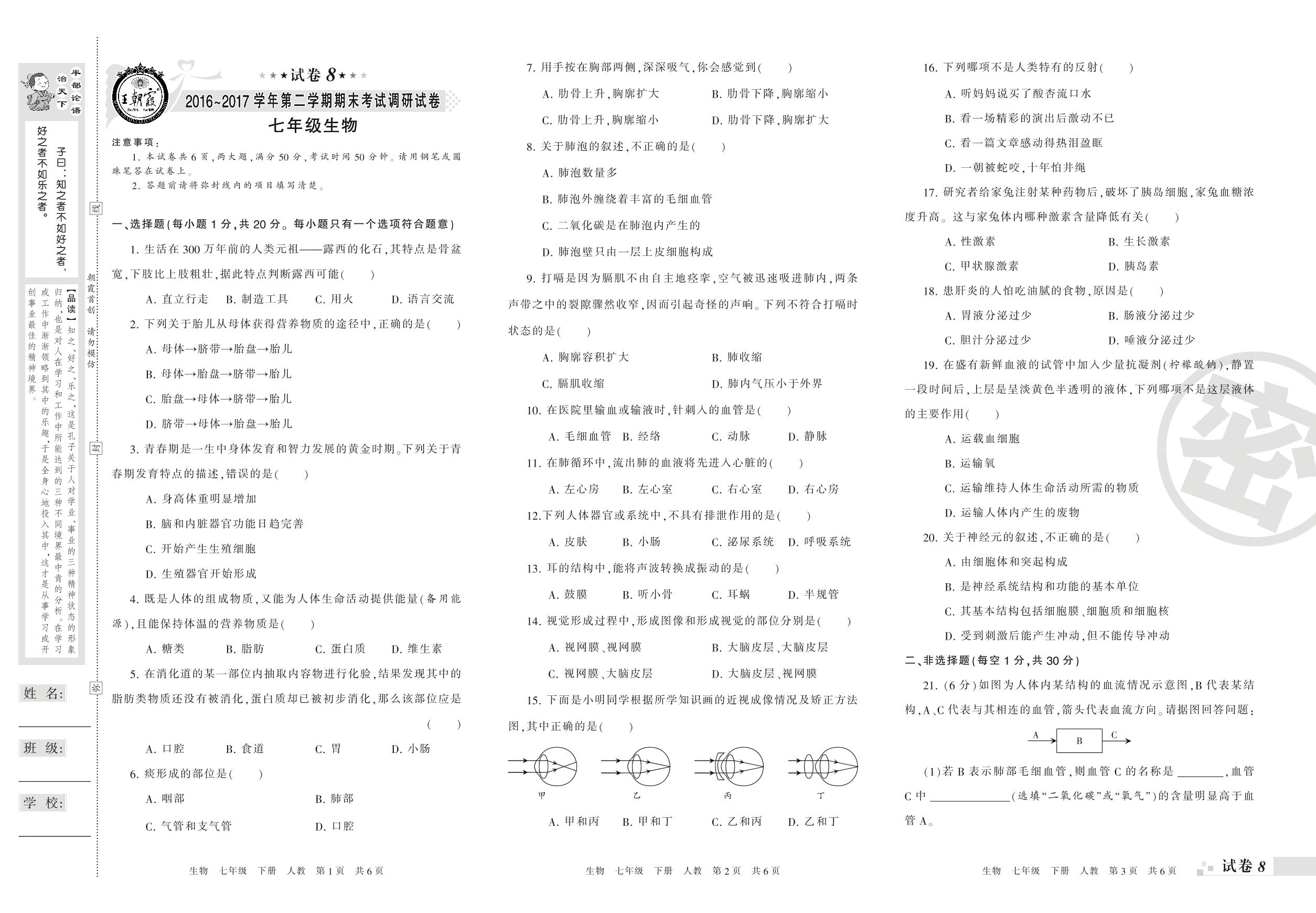 2016-2017学年第二学期期末考试调研试卷七年级下册生物(人教版)【8】
