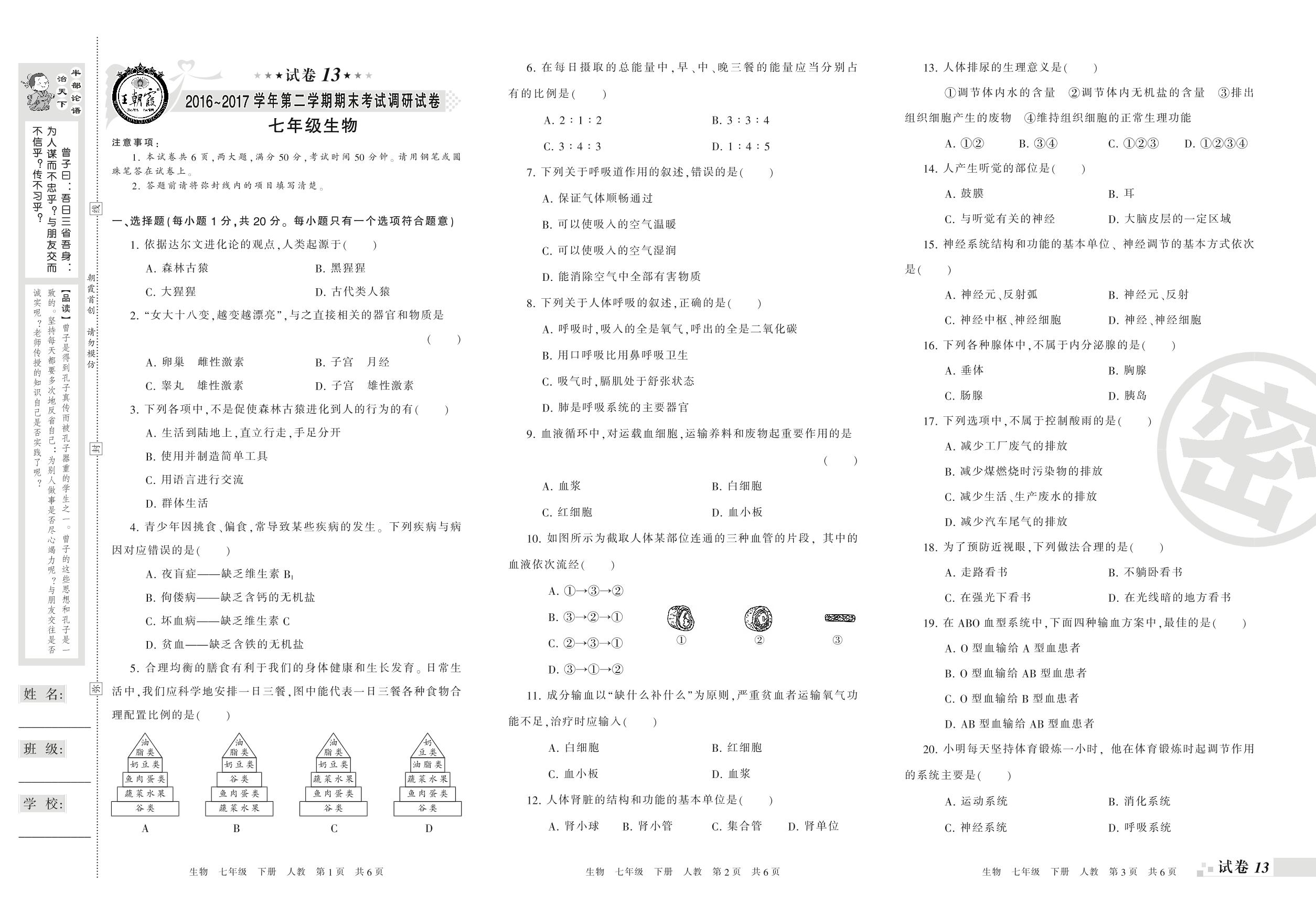 2016-2017学年第二学期期末考试调研试卷七年级下册生物(人教版)【13】