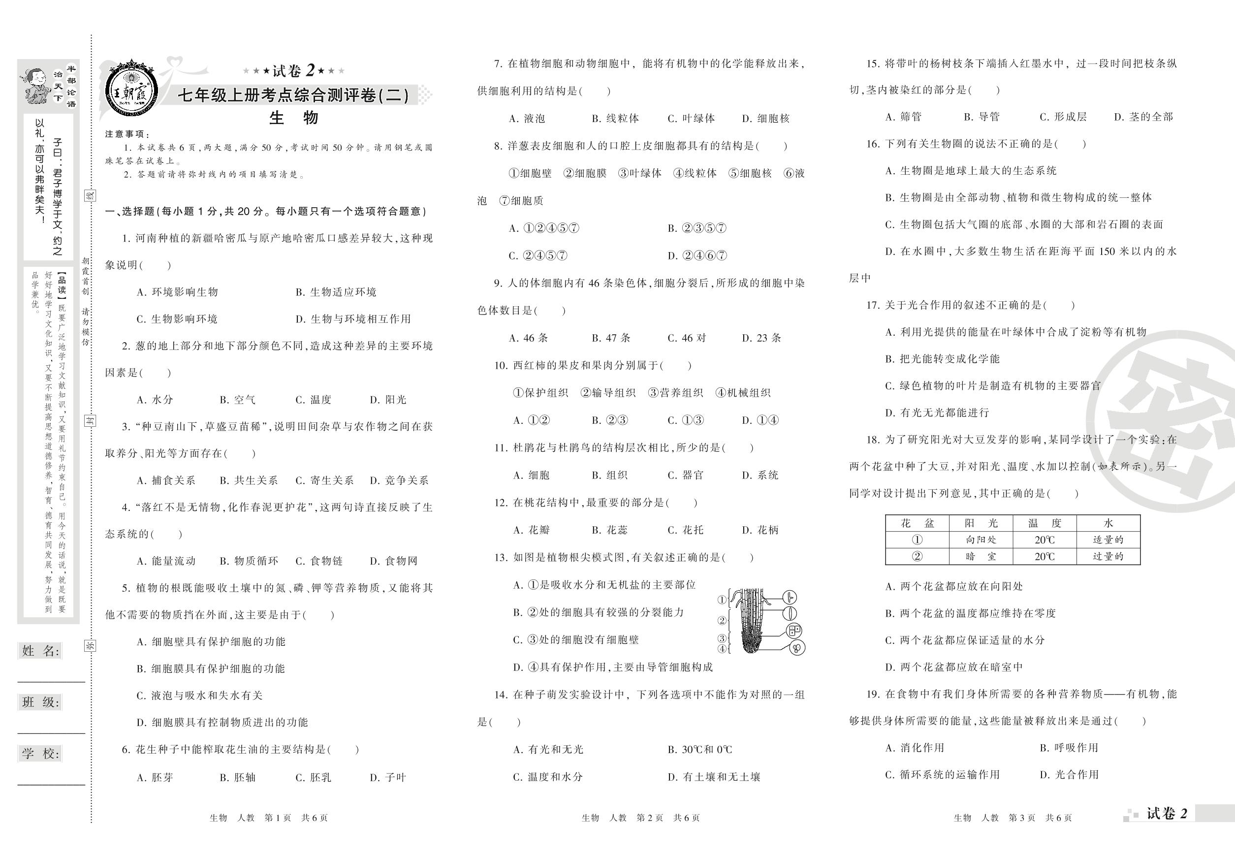 王朝霞期末测评卷——考点综合测评卷(二)七年级上册生物(人教版)【2】