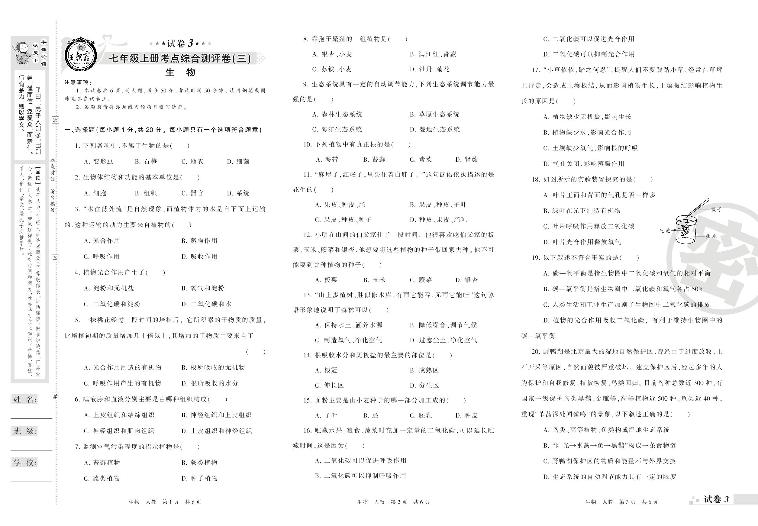 王朝霞期末测评卷——考点综合测评卷(三)七年级上册生物(人教版)【3】