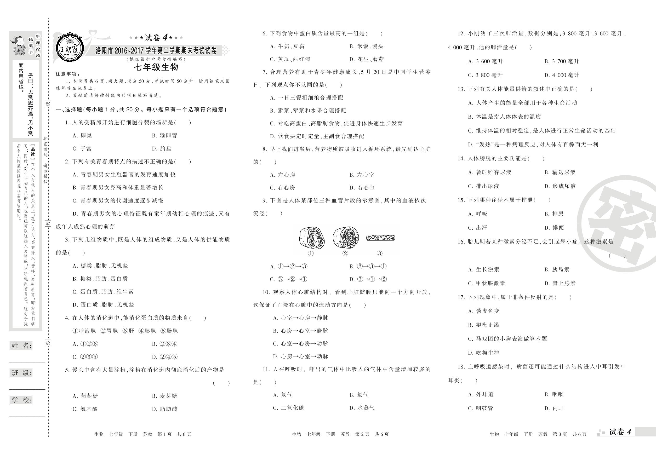 2016-2017学年第二学期洛阳市七年级生物试卷(苏教版)【4】