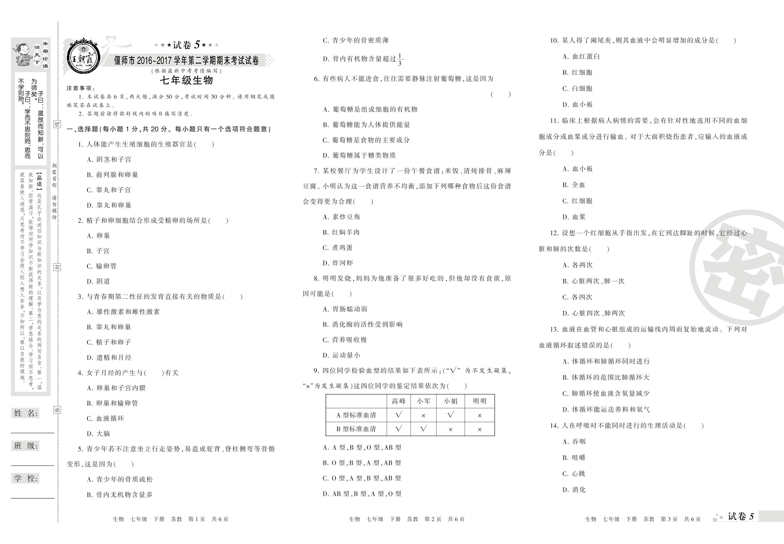 七年级生物苏教版下册期末卷