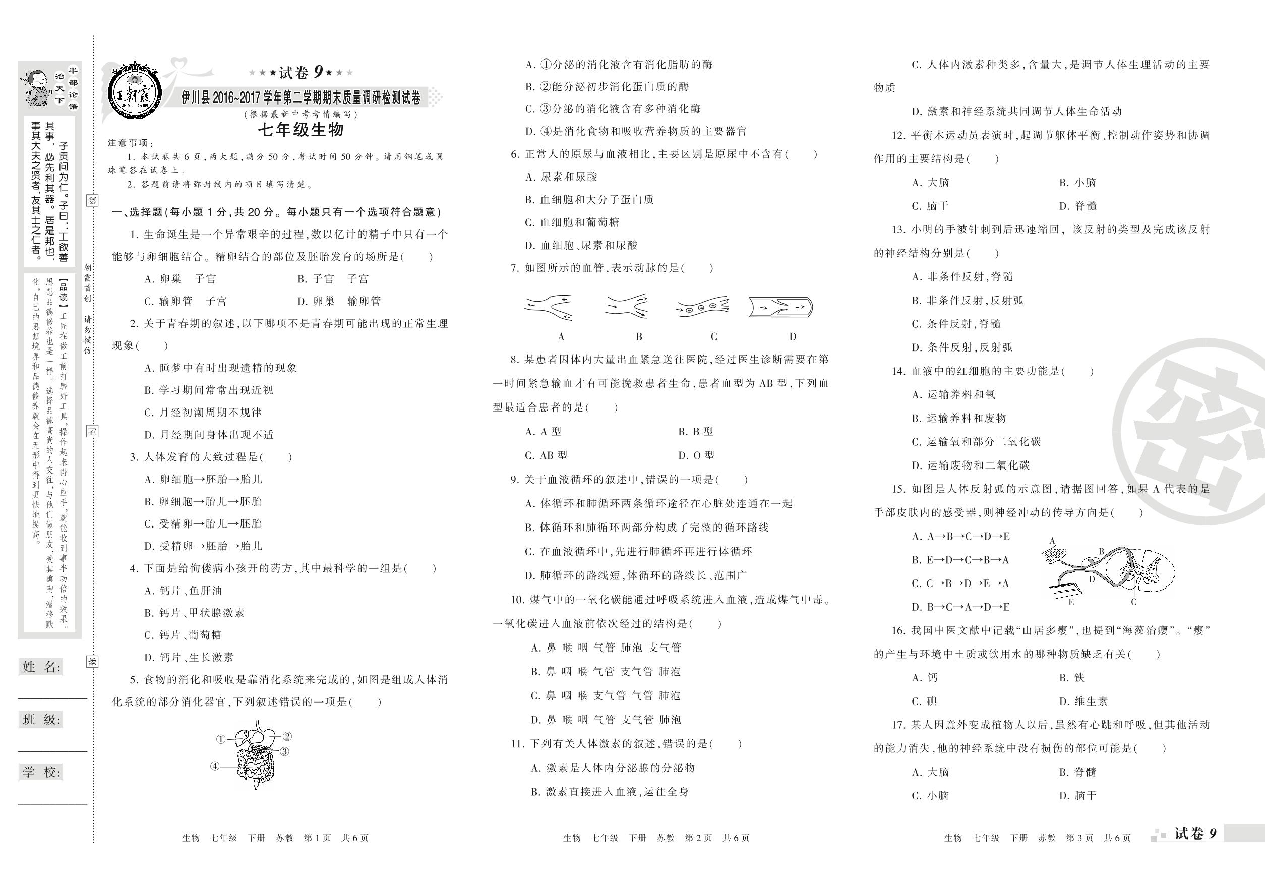2016-2017学年第二学期洛阳市伊川县七年级生物试卷(苏教版)【9】