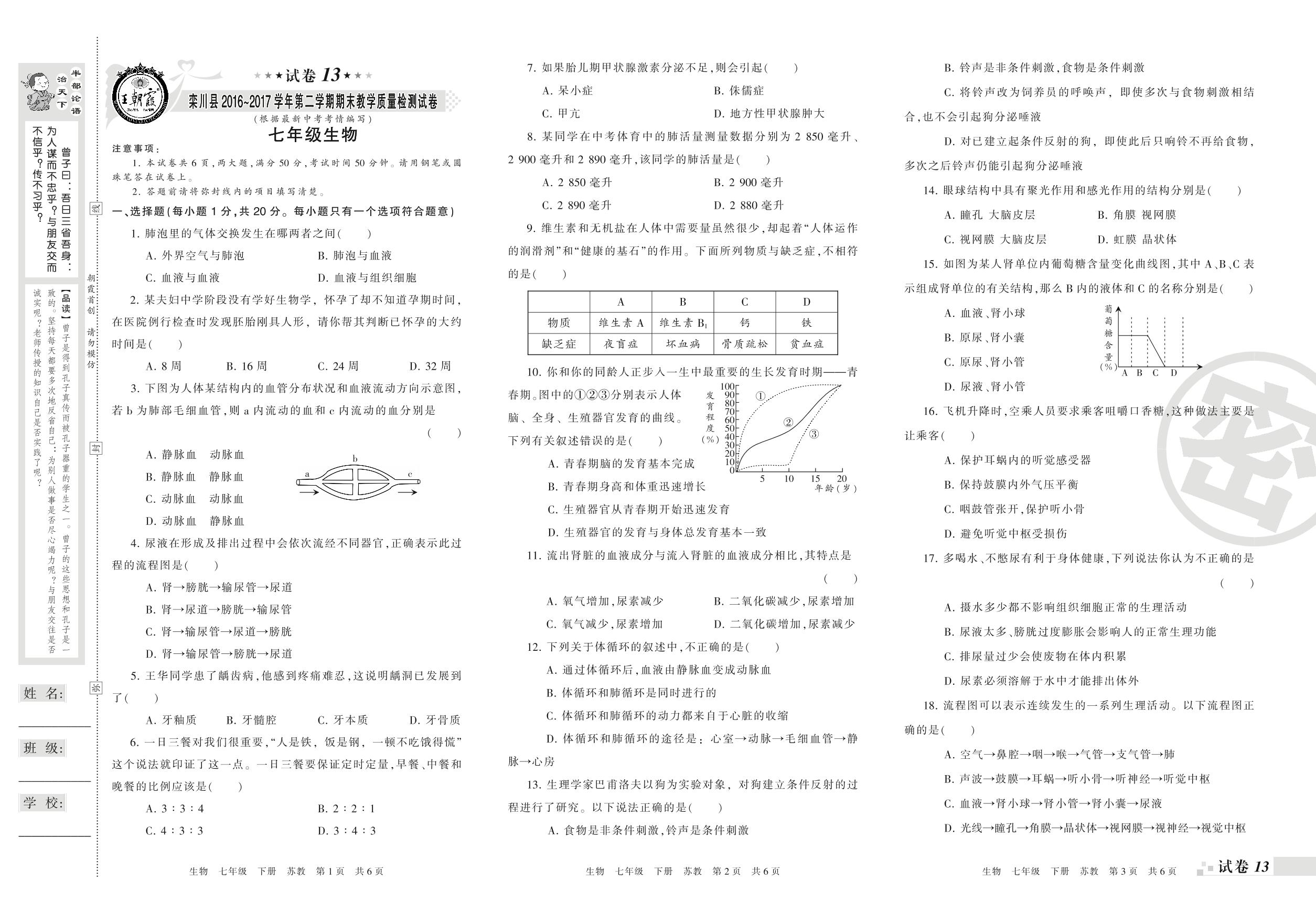 七年级生物苏教版下册期末卷