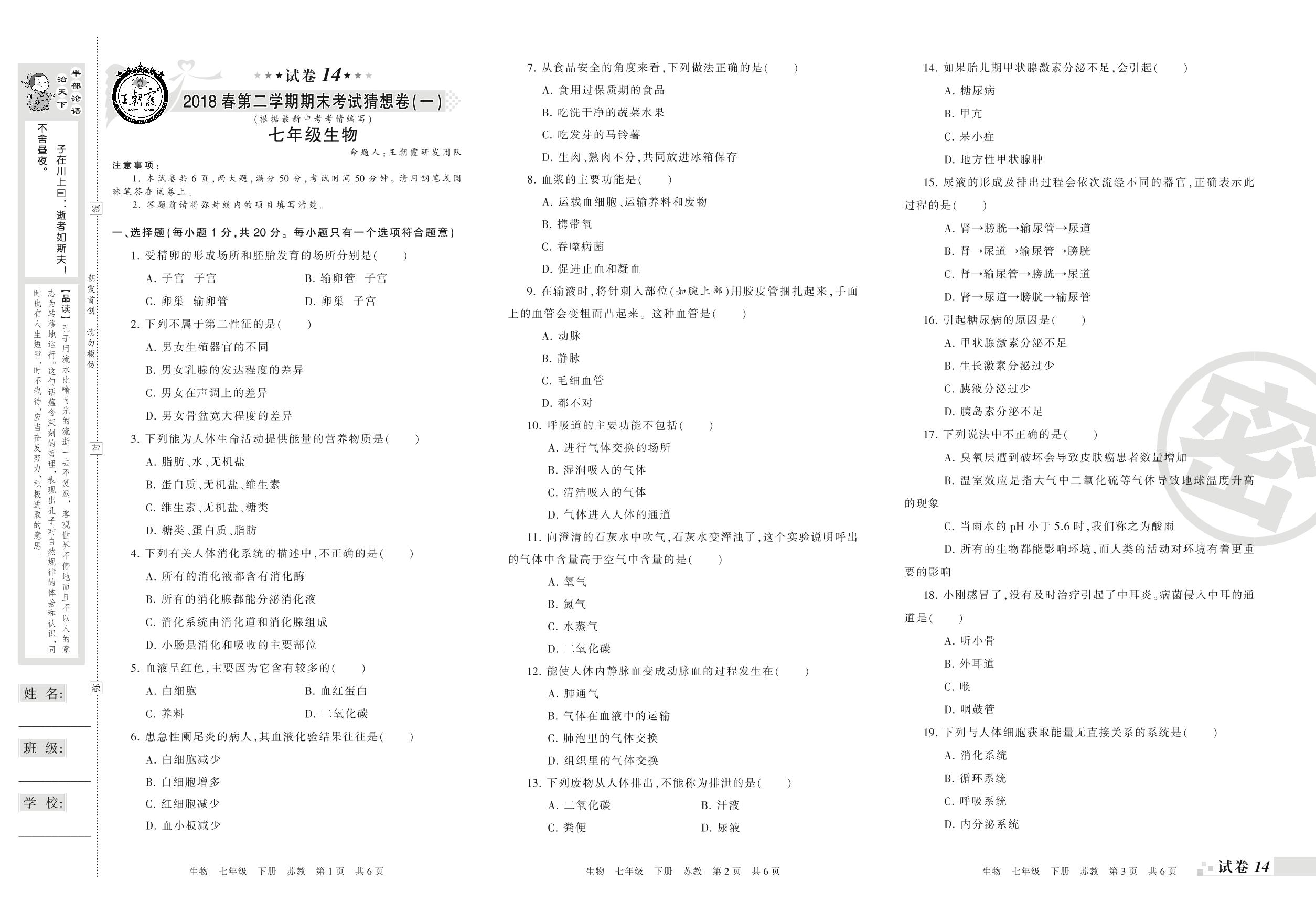 2017-2018学年第二学期期末考试猜想卷(一)七年级生物(苏教版)【14】