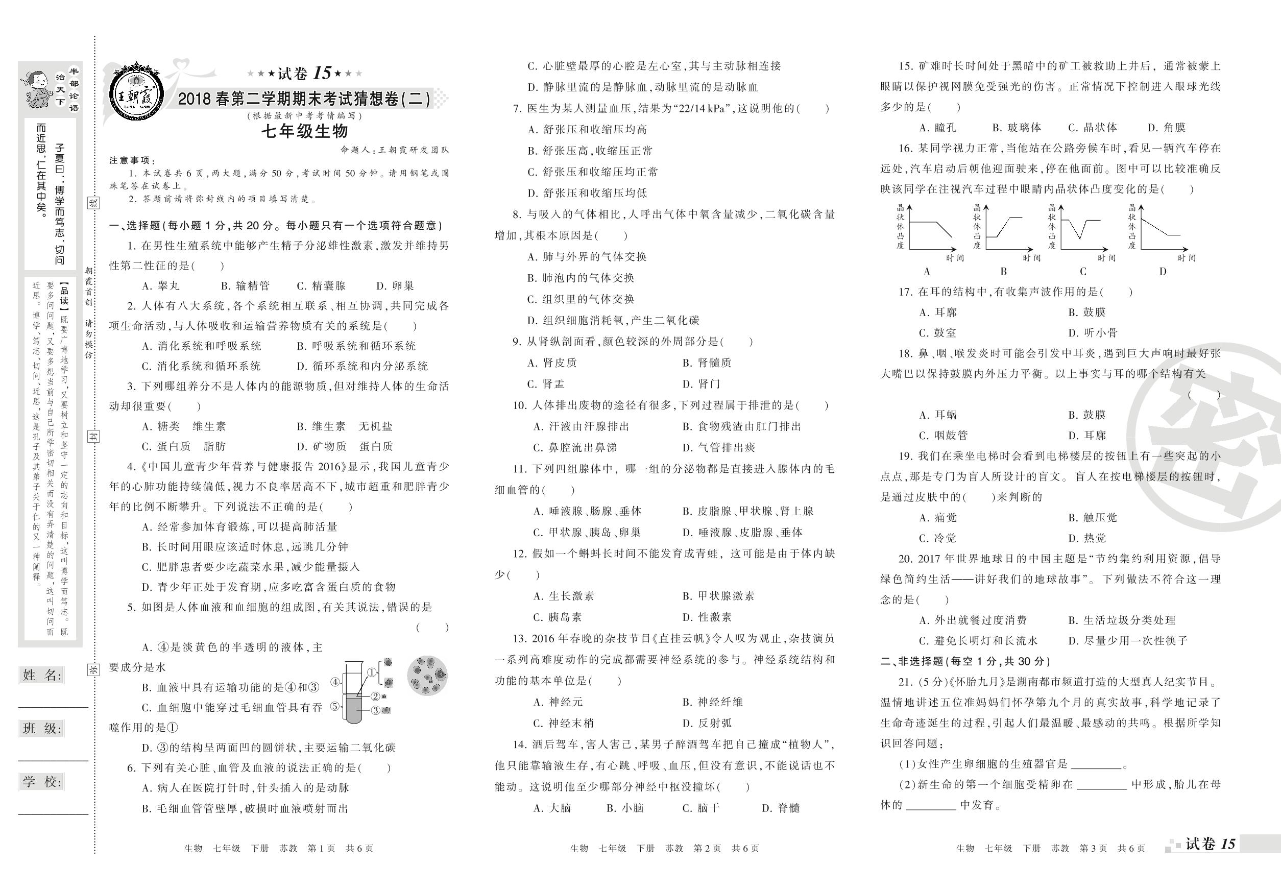 七年级生物苏教版下册期末卷