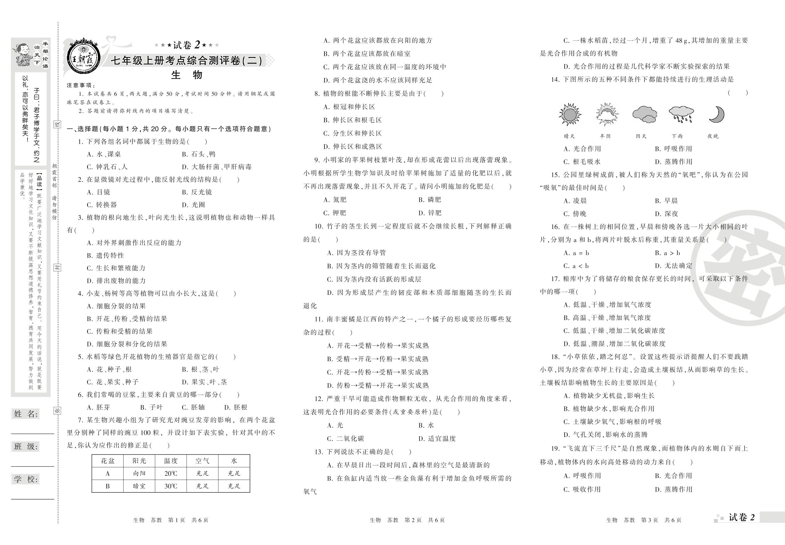 王朝霞期末测评卷——考点综合测评卷(二)七年级上册生物(苏教版)【2】