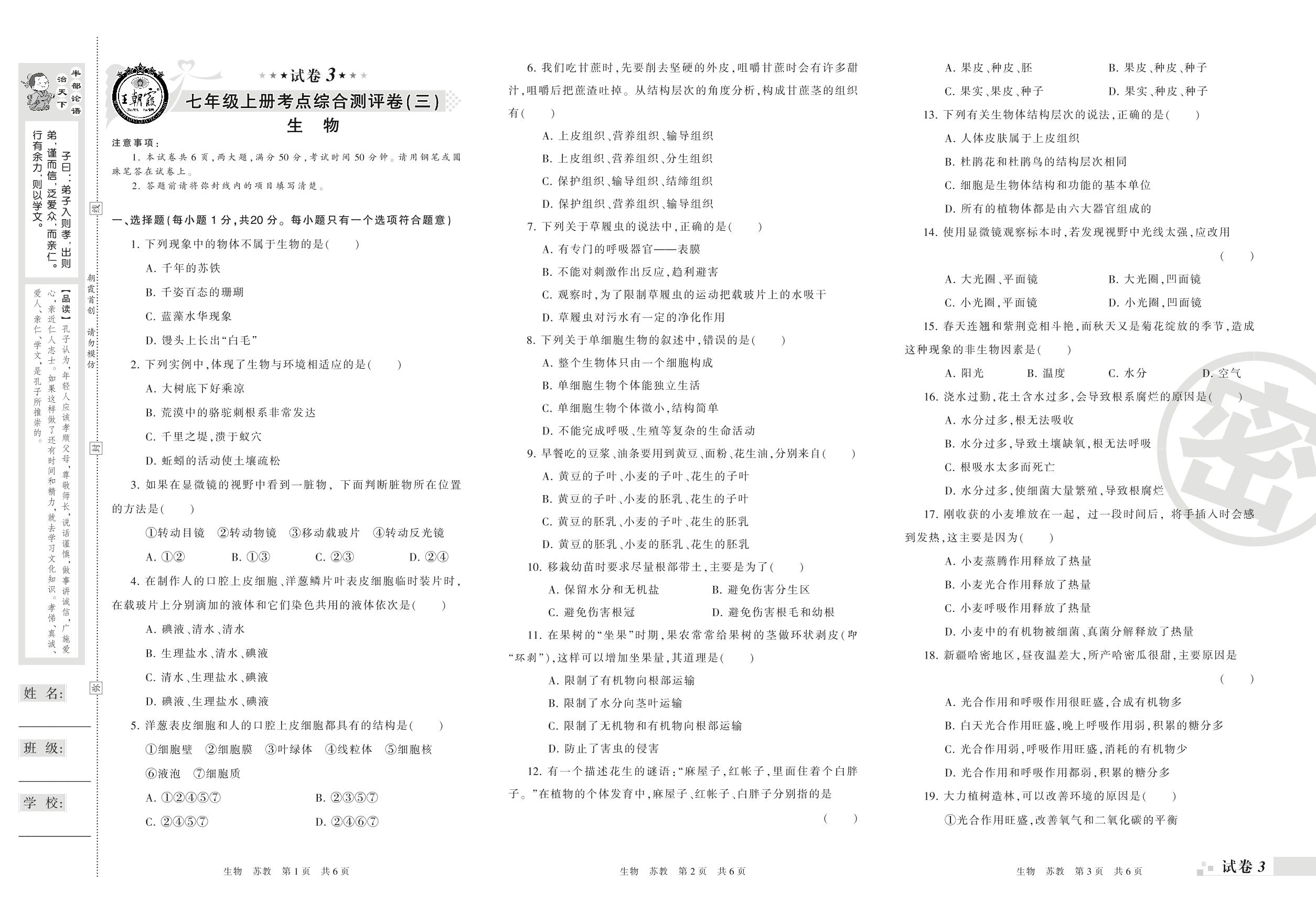 王朝霞期末测评卷——考点综合测评卷(三)七年级上册生物(苏教版)【3】
