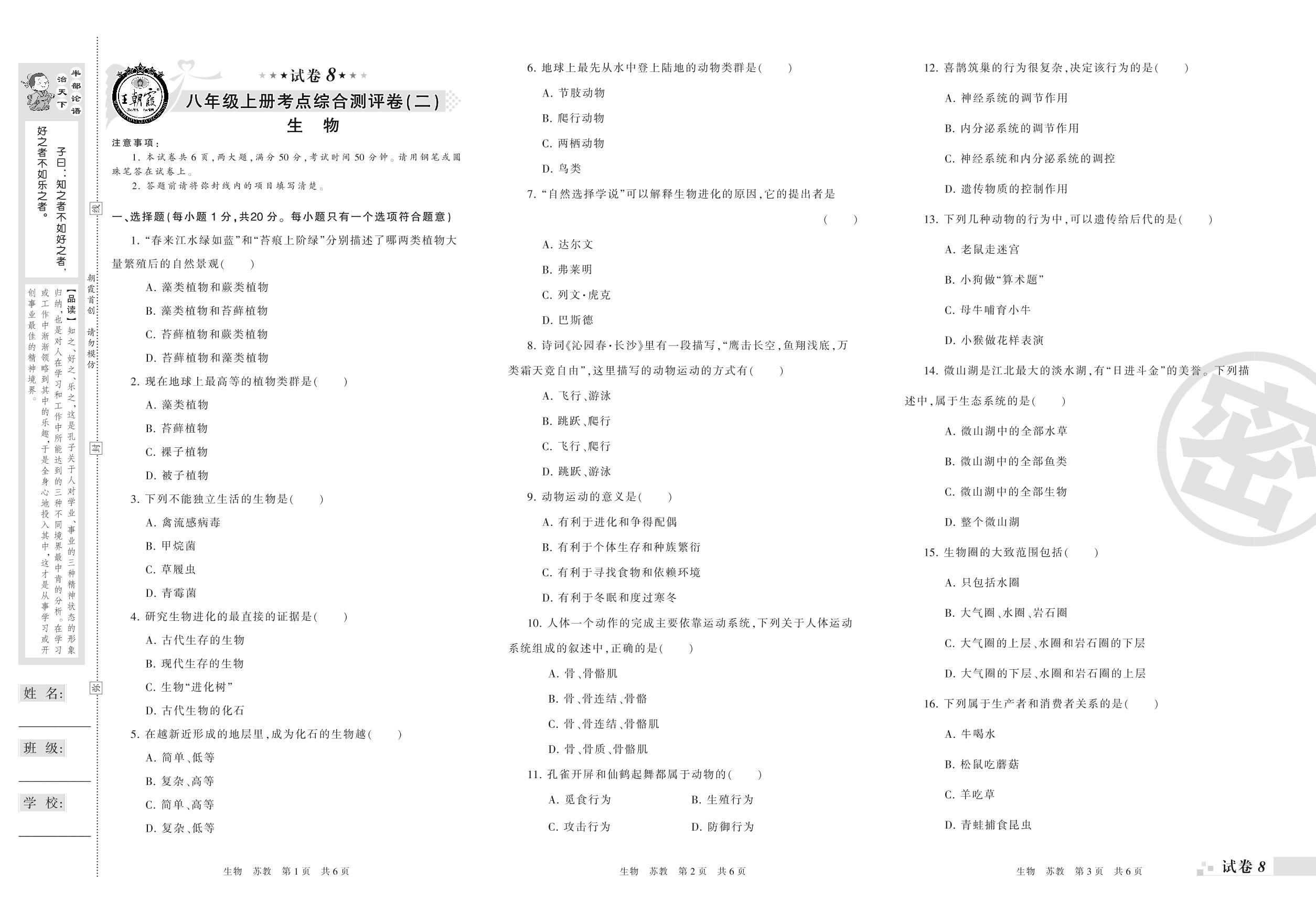 王朝霞期末测评卷——考点综合测评卷(二)八年级上册生物(苏教版)【8】