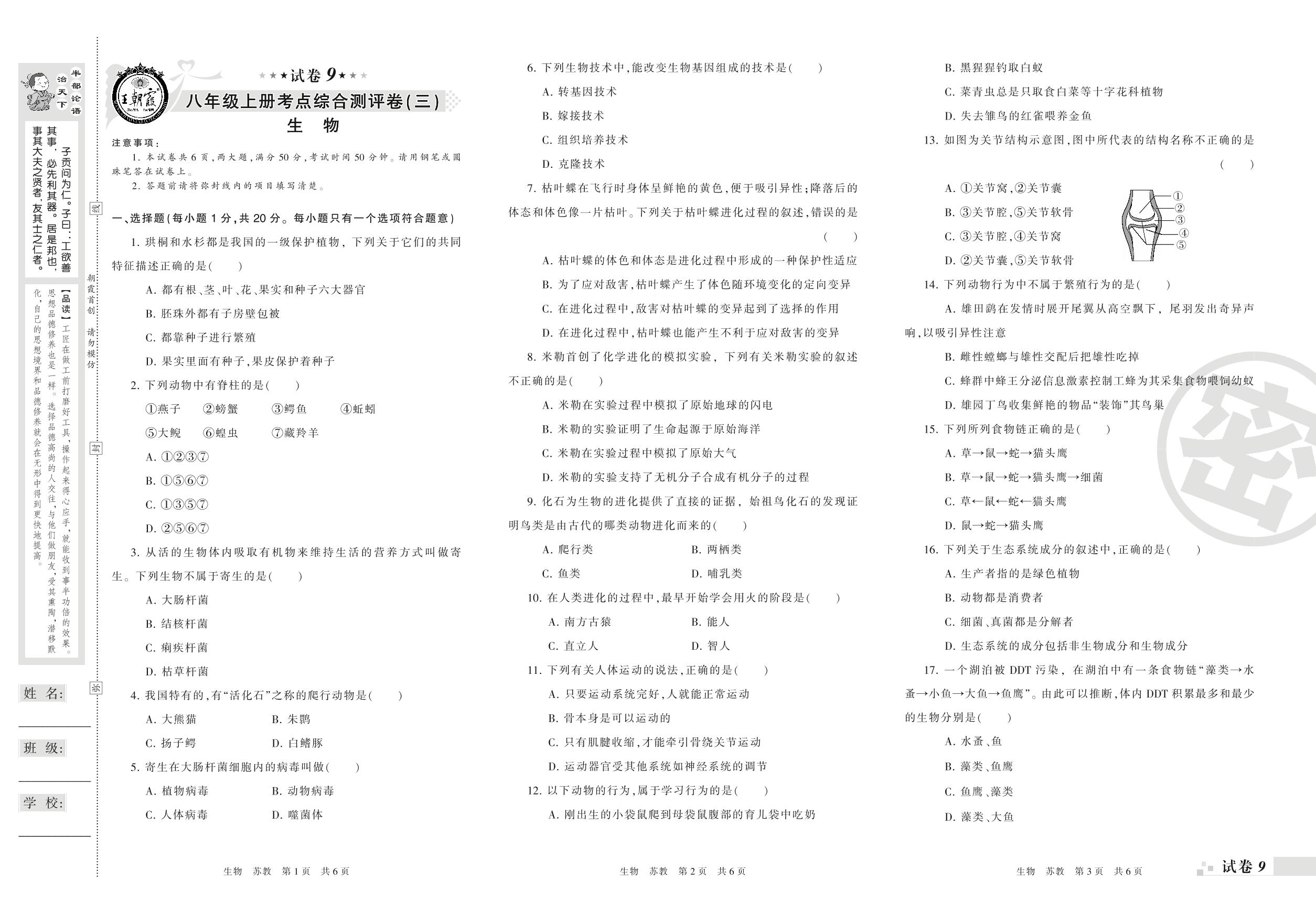 王朝霞期末测评卷——考点综合测评卷(三)八年级上册生物(苏教版)【9】