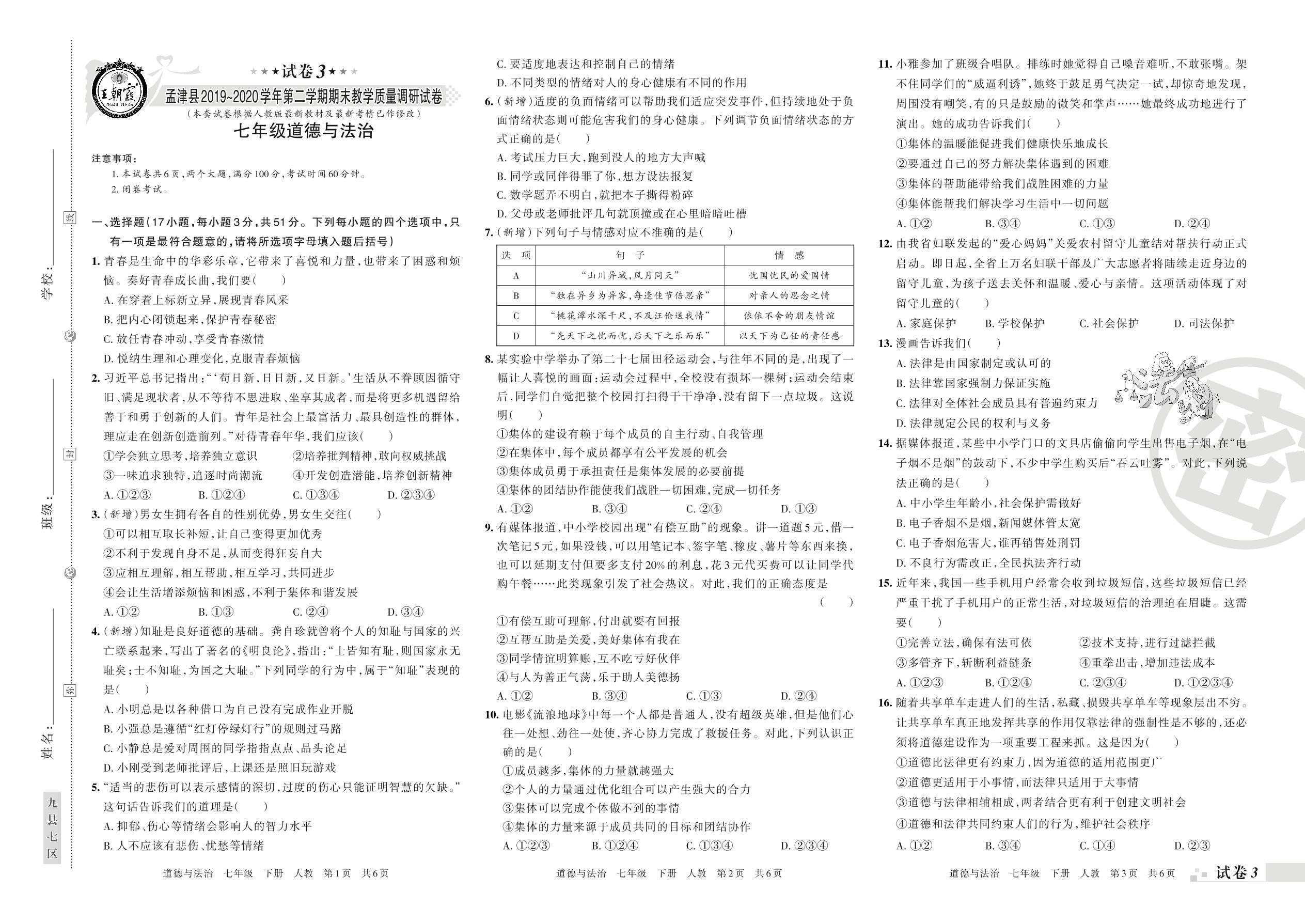 2019-2020学年第二学期洛阳市孟津县七年级道德与法治试卷(人教版)【3】