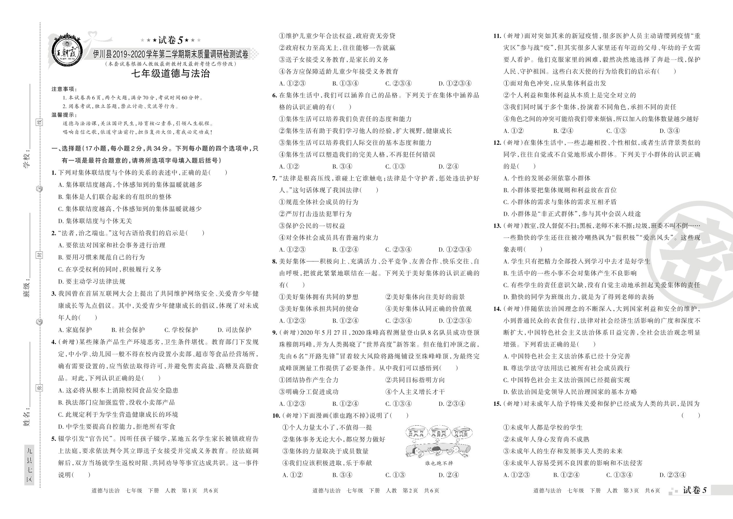 2019-2020学年第二学期洛阳市伊川县七年级道德与法治试卷(人教版)【5】