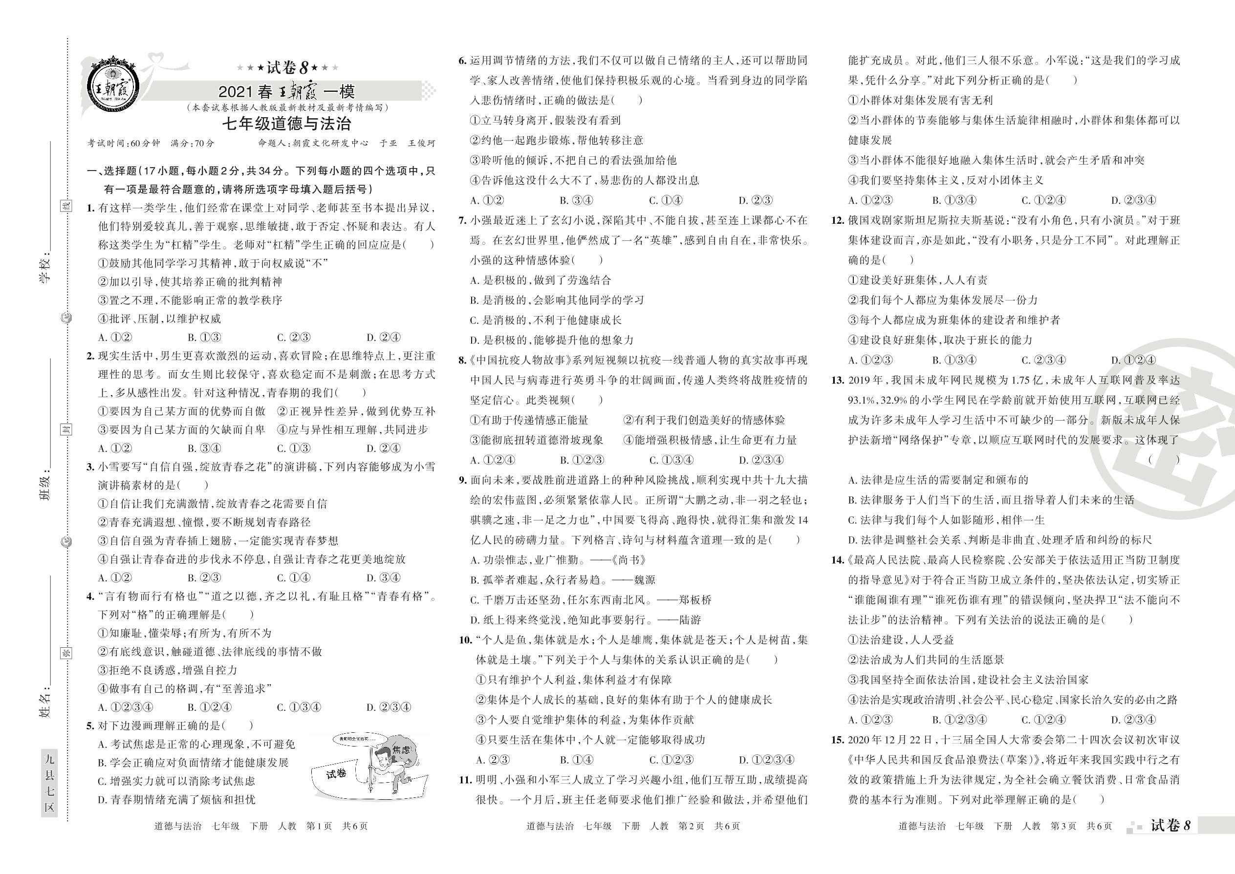 王朝霞期末模拟卷七年级下册道德与法治(人教版)_R210812134240【8】