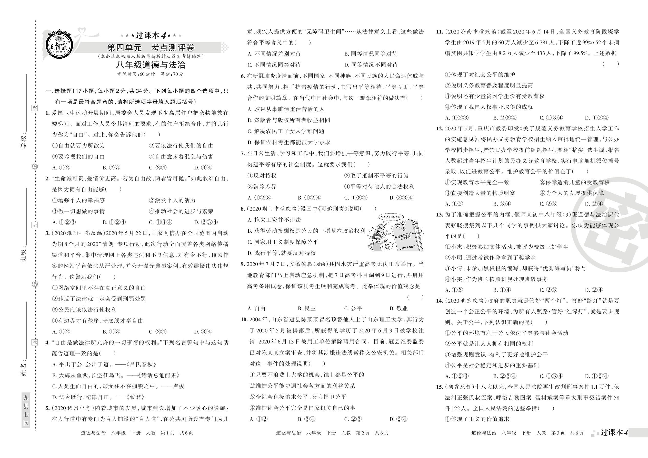 王朝霞期末过课本——第四单元考点测评八年级下册道德与法治(人教版)_R210812134332【0】