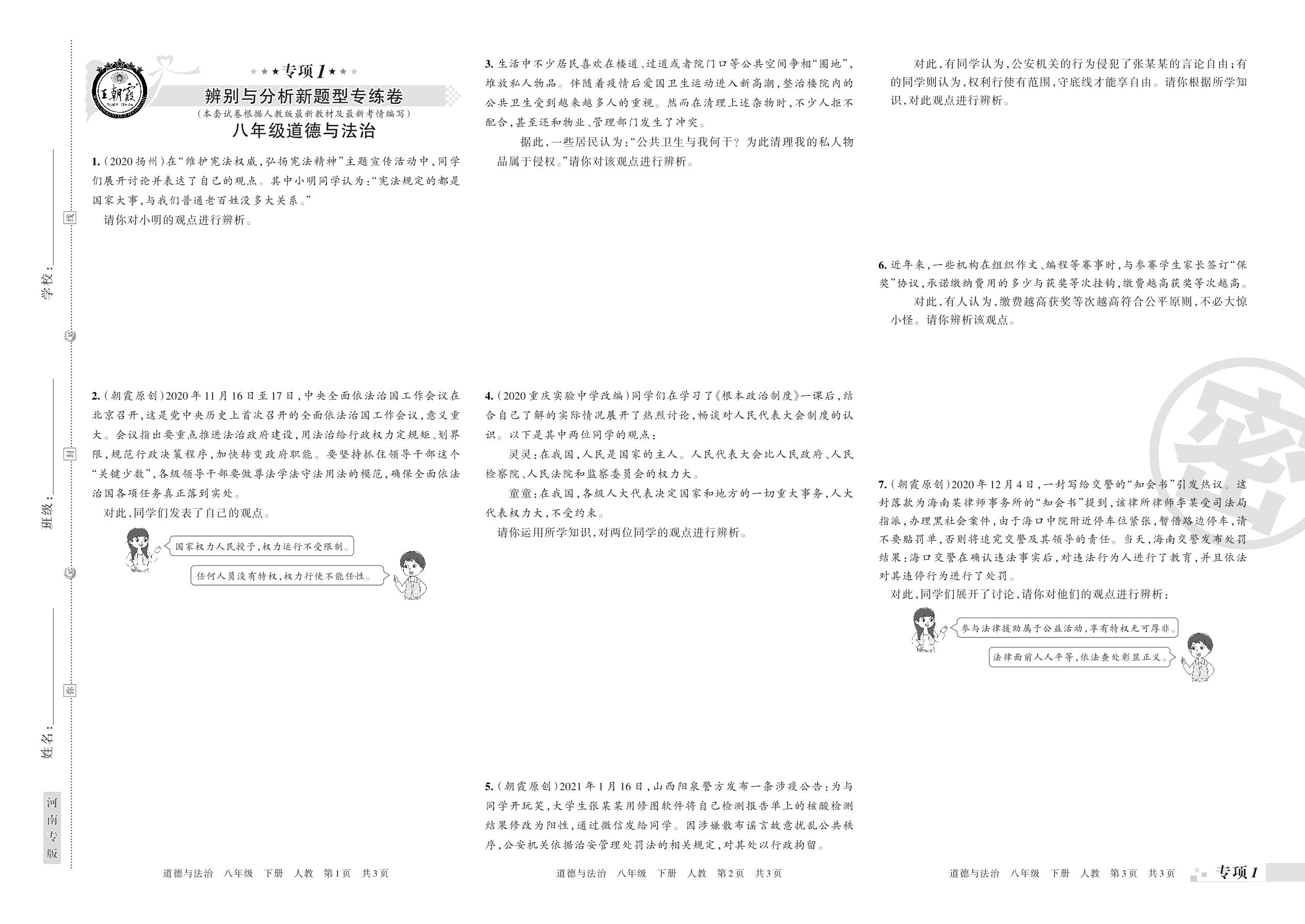 王朝霞期末专项卷——辨别与分析、观察与思考新题型专练卷八年级下册道德与法治(人教版)【0】